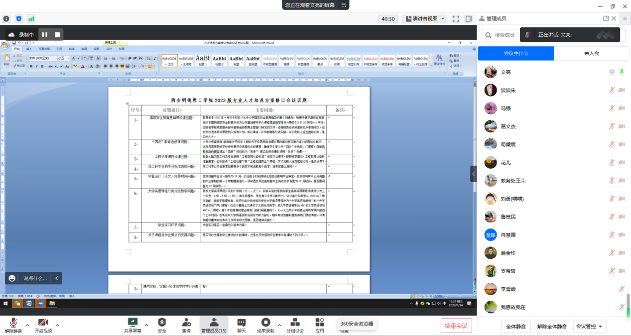 教务处副处长文亮对2023版本科专业人才培养方案修订中的问题、建议以及《关于修订雷竞技raybet登录入口本科专业人才培养方案的指导意见(2023版)》和模板及2023版课程教学大纲模板做了详细汇报。与会的委员就2023版本科专业人才培养方案的指导意见和2023版课程教学大纲模板进行了深入研讨和全面细致的审核,并以投票的形式进行表决。最终全票审议通过了《关于修订雷竞技raybet登录入口本科专业人才培养方案的指导意见(2023版)》、模板以及2023版课程教学大纲模板。