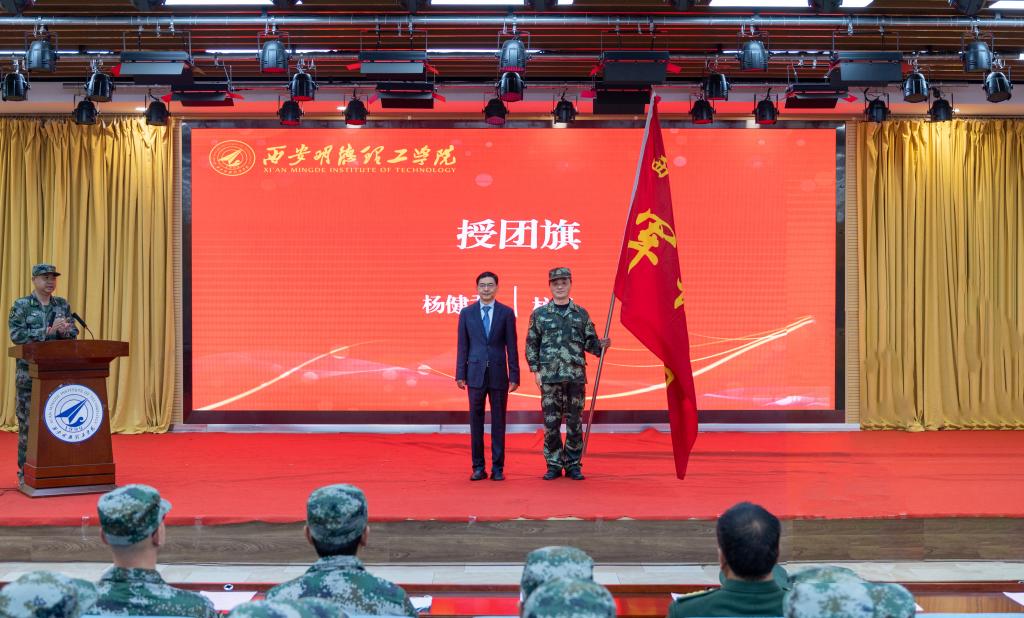 校长杨健君为军训团授团旗。