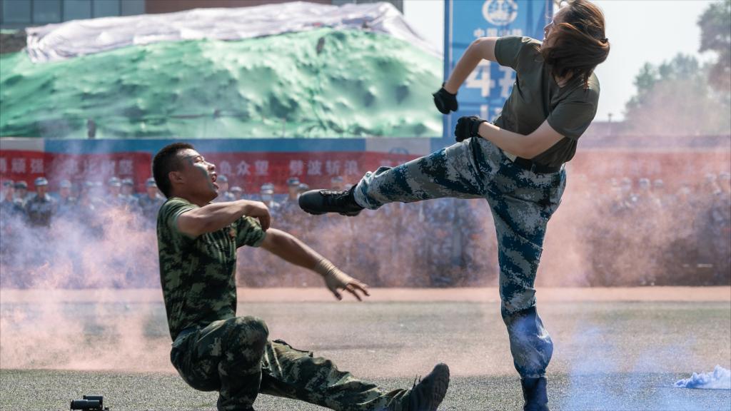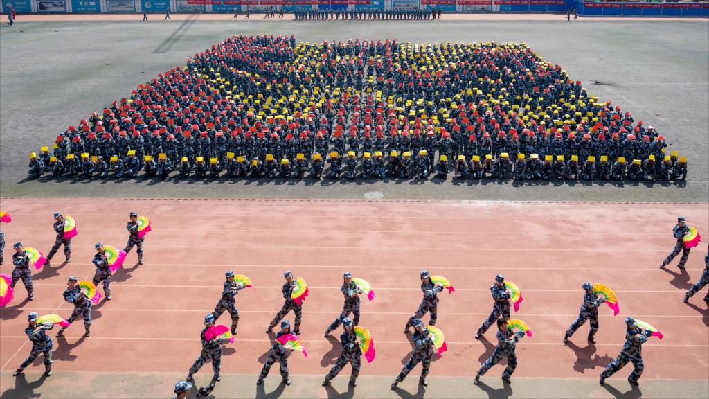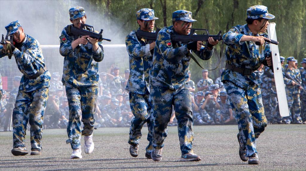 随后,军训团举行了军事科目汇报演练,倒功操、擒敌拳、战术、花样队列等表演。
