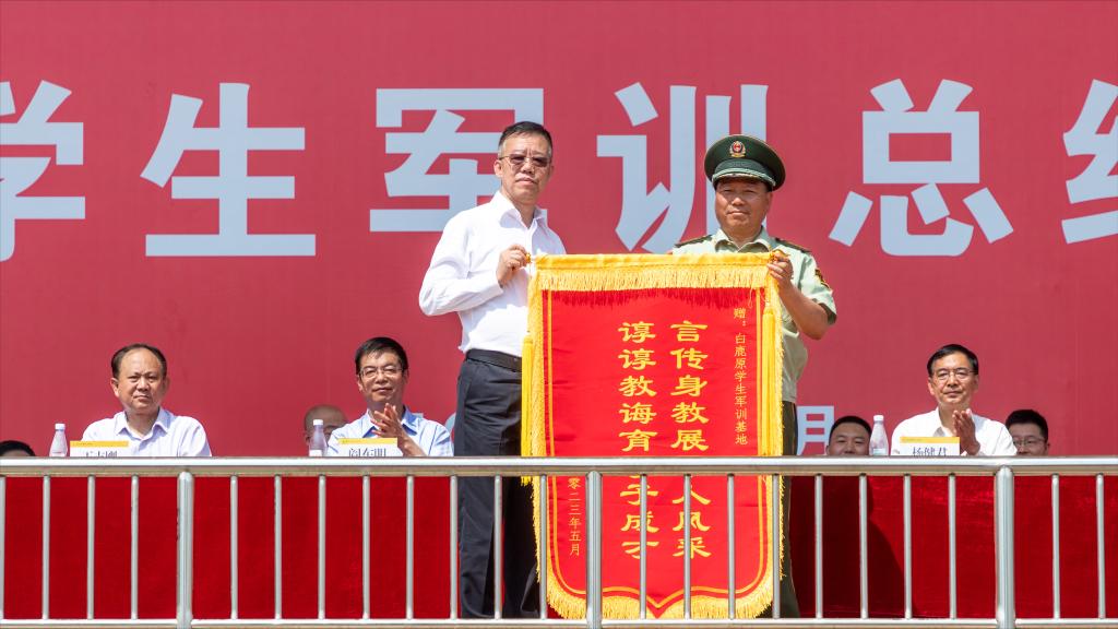 学校董事长袁汉源为承训单位白鹿原学生军训基地赠送锦旗。
