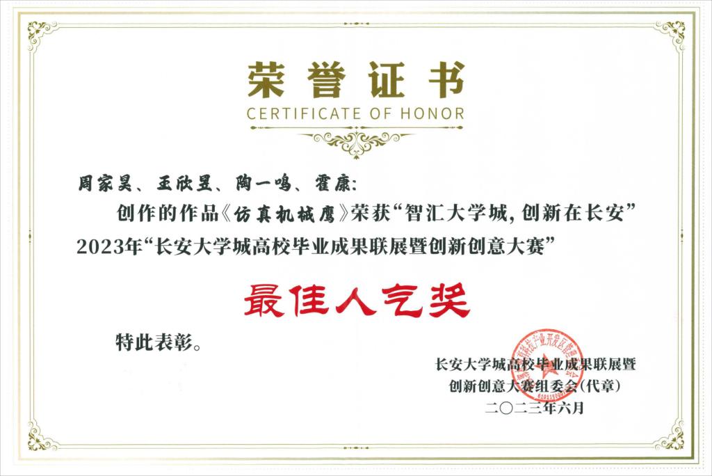 5月29日-6月5日,长安区举办了由长安区委、区政府及驻区各高校主办,区委组织部(区委人才办)、郭杜开发区承办的长安大学城高校毕业成果联展暨创新创意大赛。大赛旨在为毕业成果交易和人才推介搭建平台,助力高校师生创意落地、科技成果转化,推进长安区人才队伍建设和科技创新工作,让广大学生爱上长安、留在长安、创业长安、贡献长安。雷竞技官网王泽老师指导的《仿真机械鹰》作品喜获“最佳人气奖”。