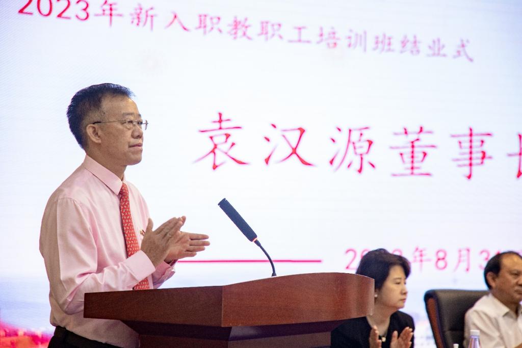 袁汉源董事长发表了热情洋溢的讲话。他对新加入明德大家庭的各位新教职工表示热烈欢迎。他首先介绍了学校的发展历程和取得的辉煌成就。他表示,金叶科教集团将着力提升教育事业在集团产业布局中的地位,切实履行投资人职责,充分发挥自身优势,为学校在基本建设投资及教育教学事业投入方面提供稳定、可靠的资金保障,将雷竞技raybet登录入口打造成金叶科教集团教育产业“旗舰店”。同时,他提出三点希望:一是要凝心铸魂,坚守为党育人、为国育才的初心使命,落实立德树人根本任务,用最佳实践去回答培养什么人、怎样培养人、为谁培养人这一根本问题。二是要引才聚才,学校瞄准国家重大战略需求,紧扣高质量发展主题主线,积极推进精准引才、系统育才、科学用才、用心留才,打造人才集聚之地、人才辈出之地、人才创业之地、人才向往之地,在教育强国建设中突显雷竞技raybet登录入口担当作为。三是要共同奋斗,大家要传承金叶集团30年来团结务实进取思变的优良作风,践行纳百川成海业,思进取赢未来的核心文化价值理念,传承西北工业大学公诚勇毅的优秀文化,艰苦创业、矢志奋斗。他强调,新征程是充满光荣和梦想的远征,学校要全面贯彻落实党的二十大精神,增强信念信心、坚定底气锐气,超前布局、准确识变、科学应变、主动求变,跳出教育看教育、立足全局看教育、放眼长远看教育,加强统筹谋划提升领导力,聚焦根本任务提升执行力,实施目标牵引提升竞争力,坚持人才强校提升战斗力,优化工作氛围提升向心力,在高质量发展中开辟新领域新赛道,做人无我有的开创者、人有我优的领跑者,为把学校建设成为特色鲜明、国内一流具有一定国际知名度的应用型大学而共同奋斗!