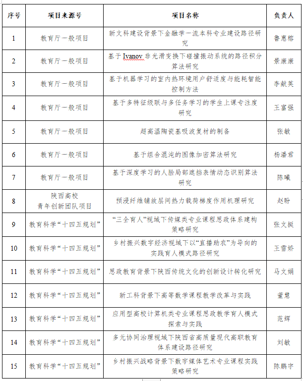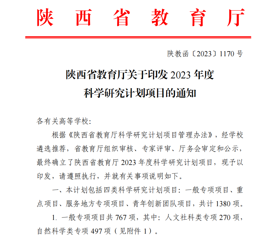 近日,陕西省教育厅发布了《关于印发2023年度科学研究计划项目的通知》(陕教函〔2023〕1170号)、《关于公布陕西省教育科学“十四五”规划2023年度课题立项名单的通知》(陕教科规办〔2023〕7号)。雷竞技官网推荐申报的8项课题获批陕西省教育厅2023年度科学研究计划项目立项,其中,一般专项项目7项,青年创新团队项目1项;7项课题获批陕西省教育科学“十四五”规划2023年度课题立项。两批次共立项15项省级科研项目。名单如下: