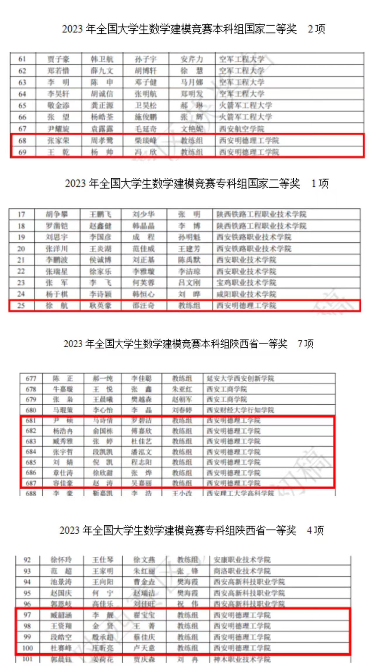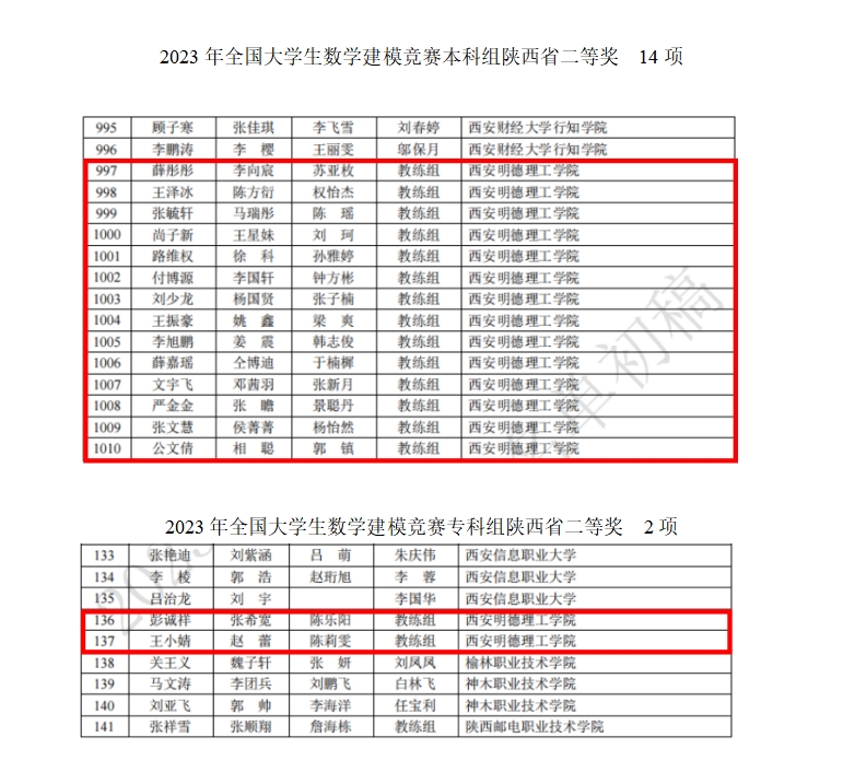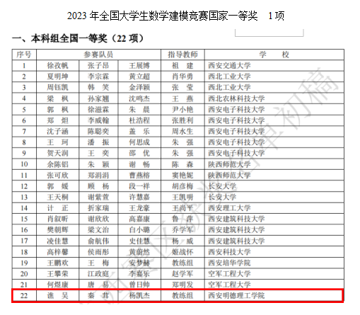 近日,2023年高教社杯全国大学生数学建模竞赛(CUMCM)成绩揭晓。经过激烈角逐,雷竞技官网共获得本科组国家一等奖1项,国家二等奖2项,陕西赛区省一等奖7项,二等奖14项;专科组国家二等奖1项,陕西赛区省一等奖4项,二等奖2项,并蝉联陕西赛区优秀组织奖,李妮老师被评为陕西赛区优秀指导教师。