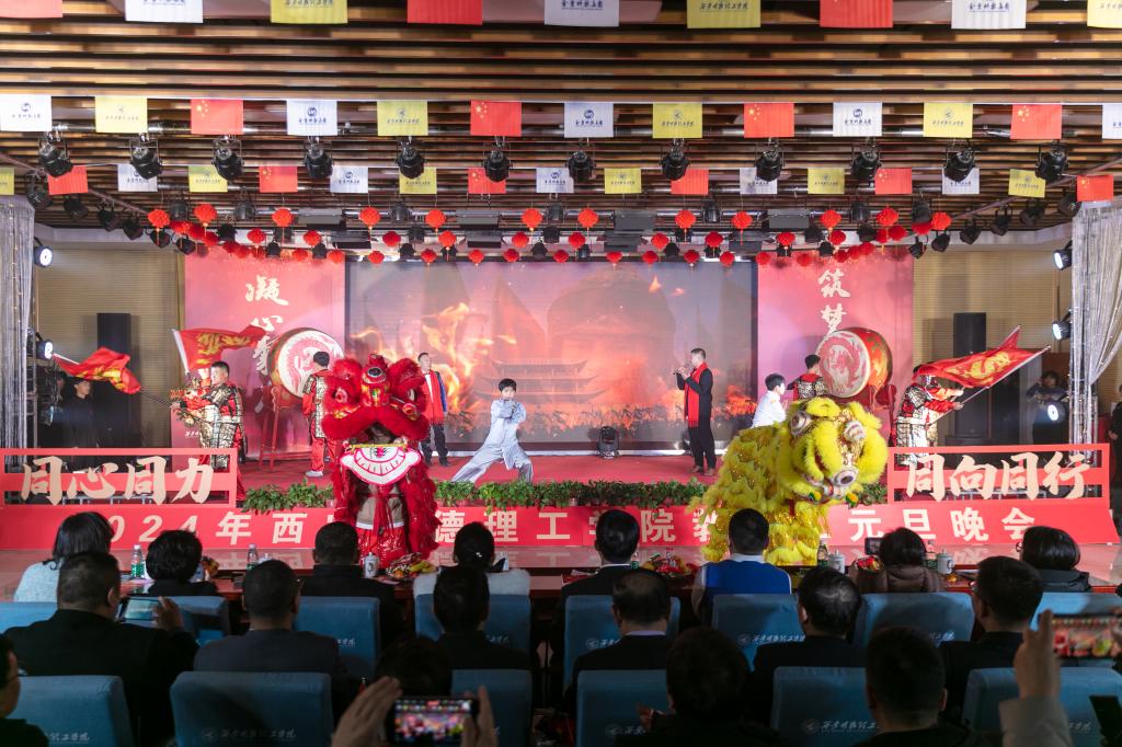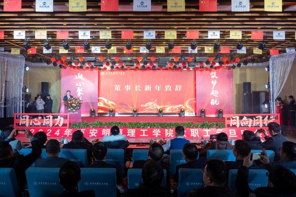 会上,学校董事长袁汉源发表了2024年新年致辞。他代表陕西金叶科教集团、明德源教育集团和学校董事会向广大师生员工致以诚挚问候和新年祝福。他指出,2023年是学校全面贯彻落实党的二十大精神,持续实施学校“十四五”事业规划。学校董事会、明德源教育集团和学校领导班子牢记为党育人,为国育才使命,以推动学校高质量转型发展打造区域特色的应用型,拼搏逐梦,凝心聚力,全力推动学校各项事业全面发展。金叶科教集团统筹指导和服务职能,切实把学校建设成为集团教育事业的标杆和“旗舰校”。今年以来,学校以励精图治、时不我待的责任担当,凝心聚力抓评建,开拓创新谋发展,为实现学校“十四五”时期的发展目标,为建设特色鲜明、国内一流,具有一定国际知名度的高水平应用型大学而努力奋斗!