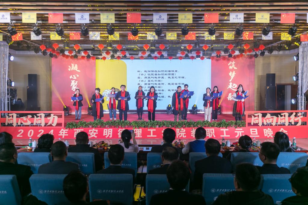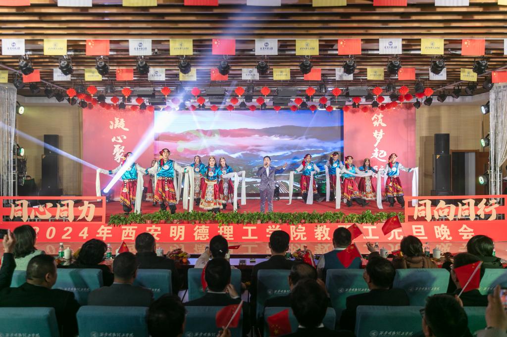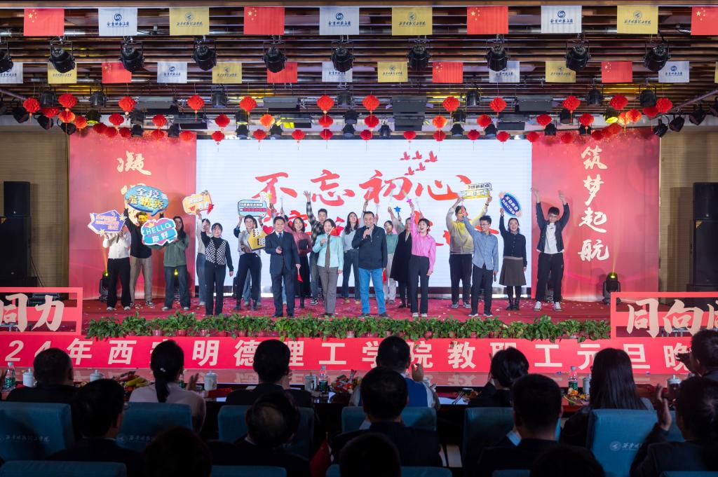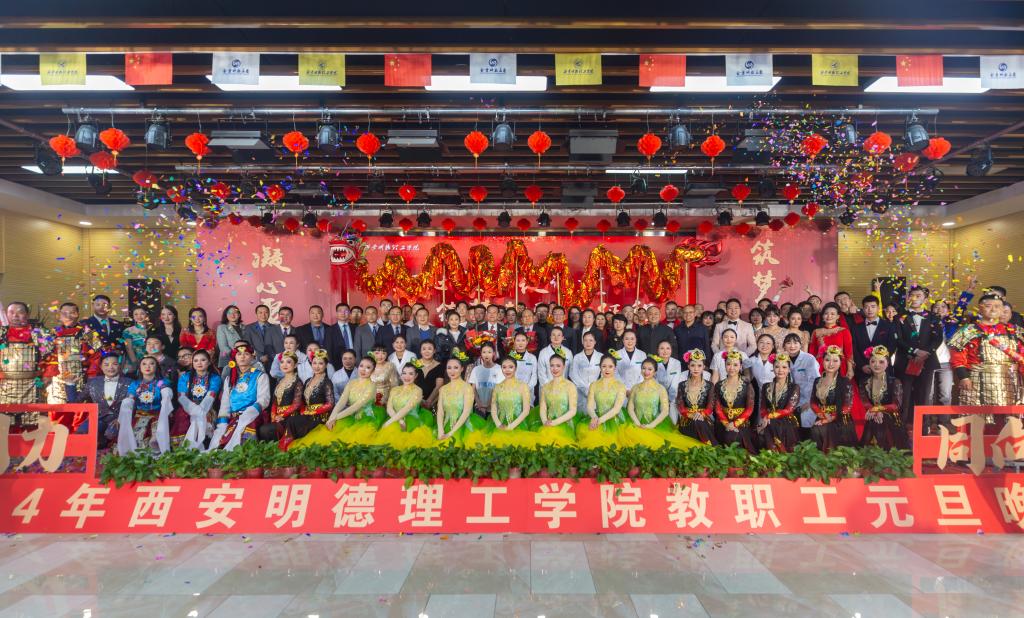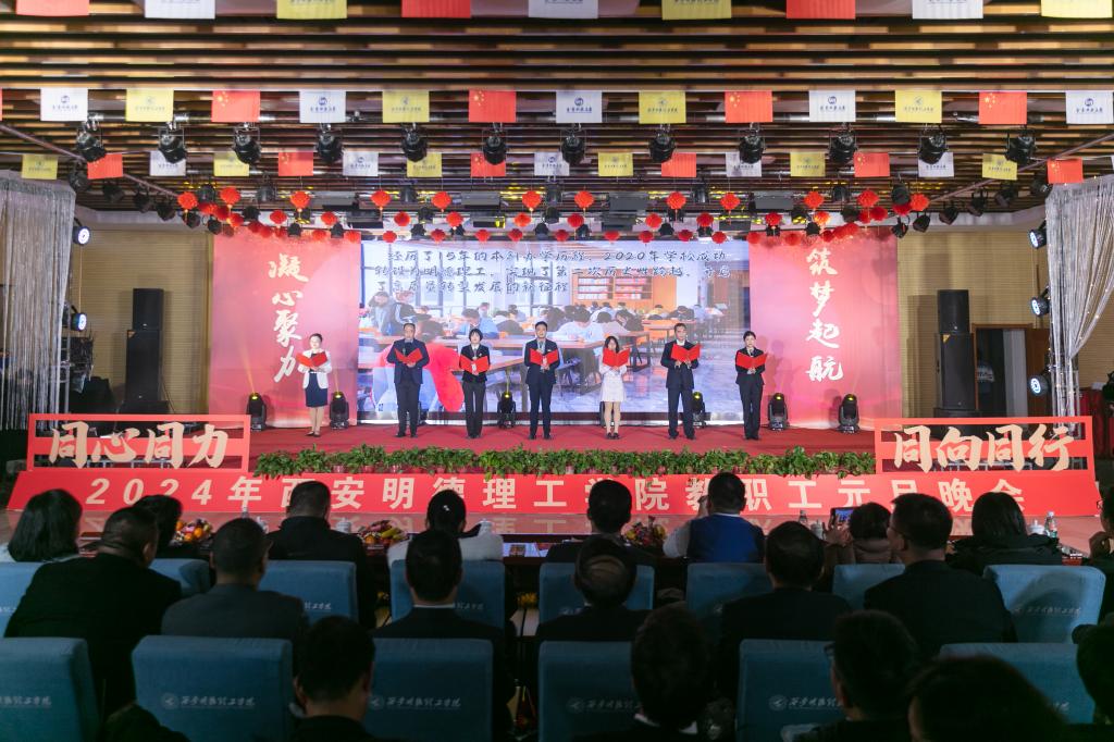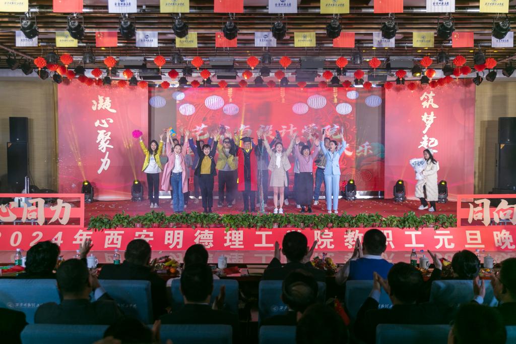 辞旧迎新元旦至,教学评建正当时。为充分展示学校教职工蓬勃向上的精神面貌,增添喜迎新年的祥和氛围,丰富校园文化生活,提高教职工的向心力和凝聚力,激发教职工的积极性和创造性,让大家度过一个祥和、快乐的元旦佳节,12月29日晚,学校在建德楼203室隆重举行“凝心聚力促评建筑梦起航新征程”2024年教职工元旦晚会。金叶科教集团董事局主席、总裁,明德源教育集团董事长、总裁,学校董事长袁汉源,明德源教育集团助理总裁张琳,明德源教育集团常务副总裁王鹏飞、财务总监田雪、总裁助理李瑞出席晚会,学校全体校领导、教职工共计400余人参加晚会。