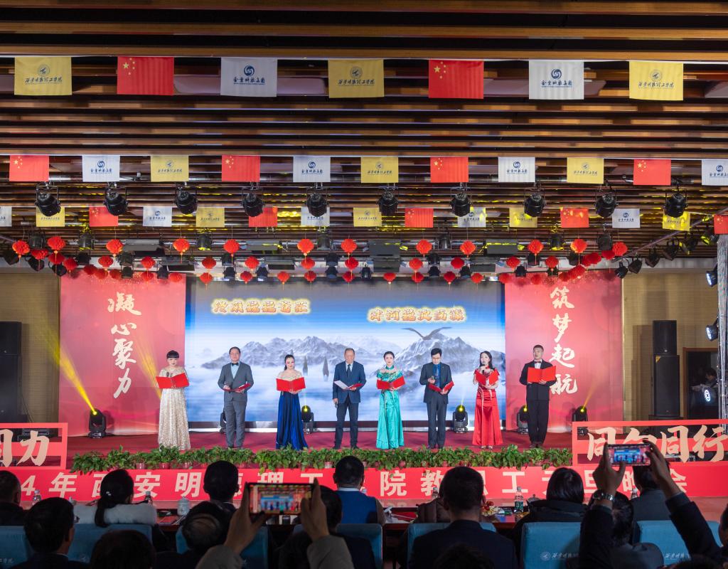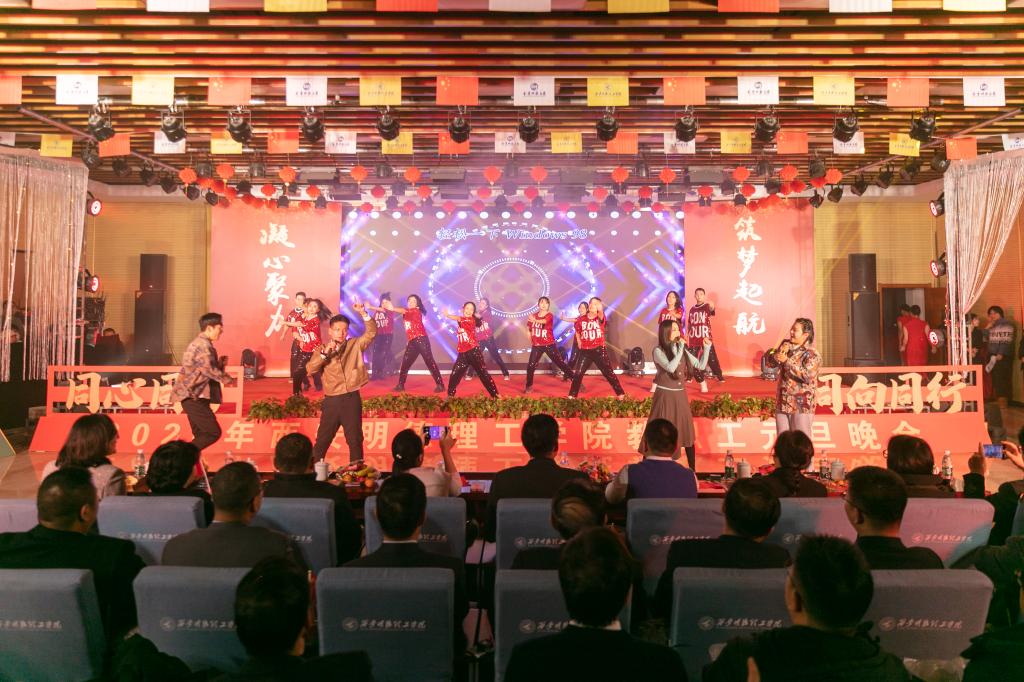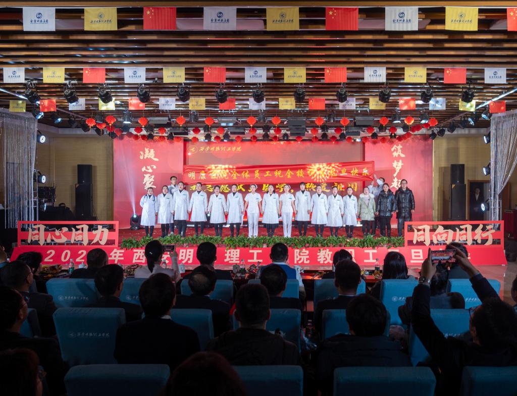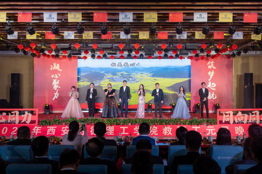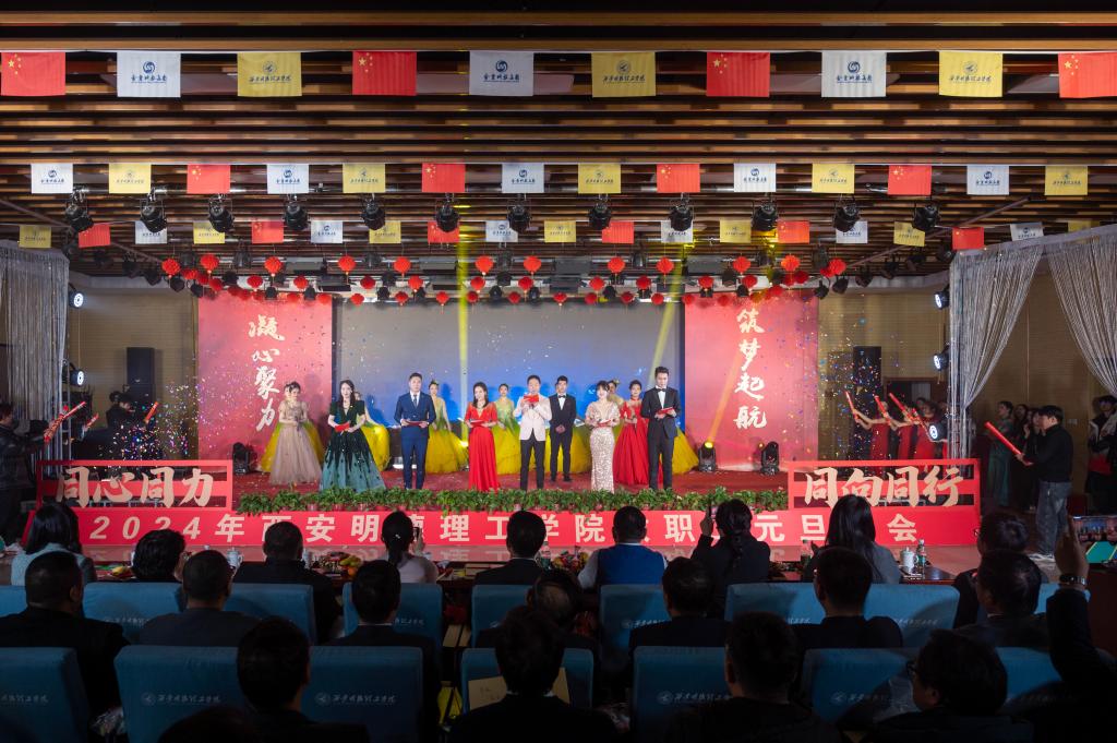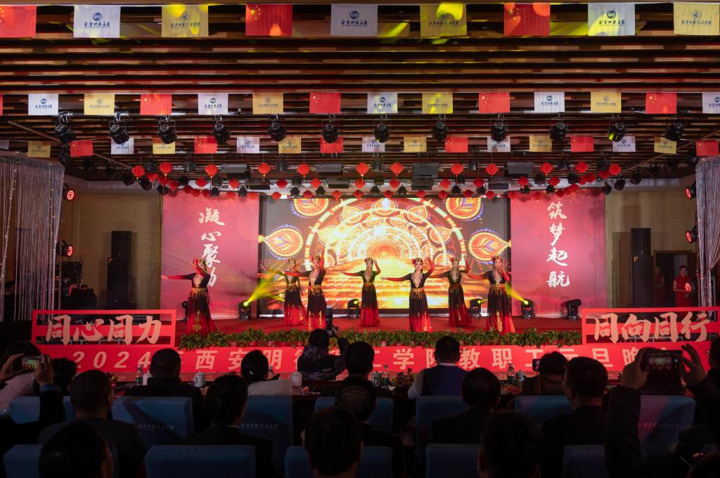 辞旧迎新元旦至,教学评建正当时。为充分展示学校教职工蓬勃向上的精神面貌,增添喜迎新年的祥和氛围,丰富校园文化生活,提高教职工的向心力和凝聚力,激发教职工的积极性和创造性,让大家度过一个祥和、快乐的元旦佳节,12月29日晚,学校在建德楼203室隆重举行“凝心聚力促评建筑梦起航新征程”2024年教职工元旦晚会。金叶科教集团董事局主席、总裁,明德源教育集团董事长、总裁,学校董事长袁汉源,明德源教育集团助理总裁张琳,明德源教育集团常务副总裁王鹏飞、财务总监田雪、总裁助理李瑞出席晚会,学校全体校领导、教职工共计400余人参加晚会。