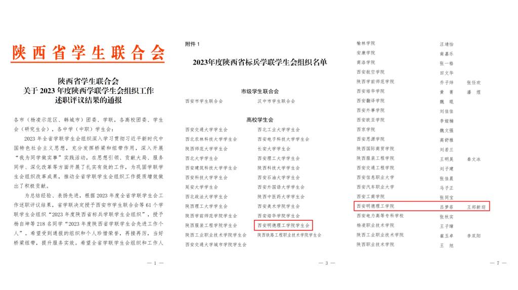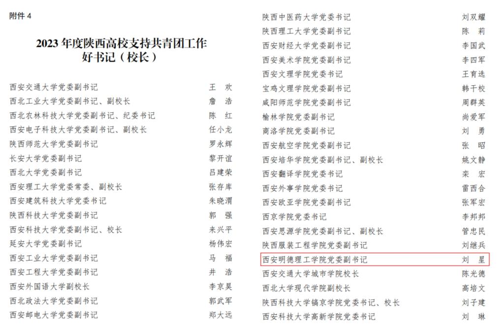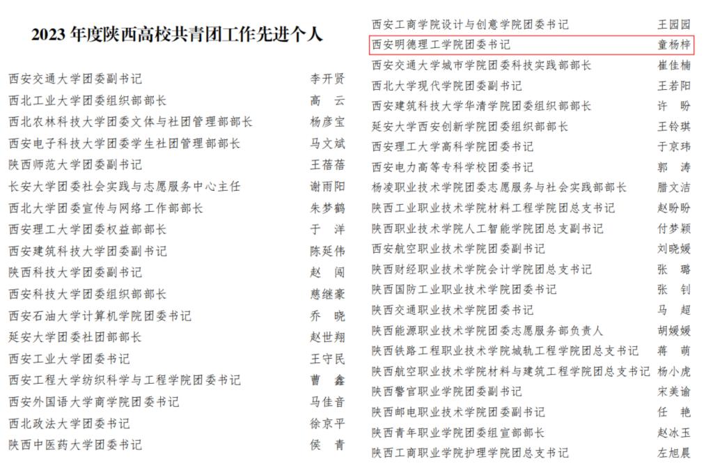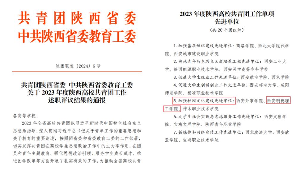 近日,共青团陕西省委、中共陕西省委教育工委联合印发《关于2023年度陕西高校共青团工作述职评议结果的通报》。雷竞技官网荣获“2023年度陕西高校共青团工作单项先进单位”,校党委副书记、副校长刘星获“2023年度陕西高校支持共青团工作好书记(校长)”,校团委书记童杨梓荣获“2023年度陕西高校共青团工作先进个人”。陕西省学生联合会下发了《关于2023年度陕西学联学生会组织工作述职评议结果的通报》,雷竞技官网学生会组织获评“2023年度陕西省标兵学联学生会组织”,学生会主要学生干部吕梦菲、王郑新迎获评“2023年度陕西省学联学生会先进工作个人”。