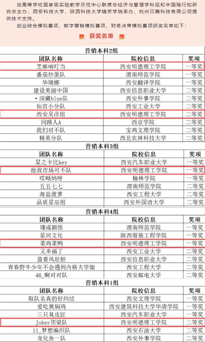 这是经济与管理学院学生首次参加“学创杯”全国大学生创业综合模拟大赛,在陕西赛区,与来自西北农林科技大学、西北大学、长安大学等33所高校共133组队伍展开激烈角逐,经济与管理学院组建的5支参赛队伍均获得奖项,其中2支队伍晋级国家总决赛。“学创杯”全国大学生创业综合模拟大赛是由国家级实验教学示范中心联席会经济与管理学科组、中国陶行知研究会主办,是教育部认可的全国普通高校大学生竞赛榜单赛事之一,侧重于提升大学生创业团队的企业运营管理能力,激发当代大学生的创业热情。经济与管理学院学生通过几个月日复一日不断练习、总结和复盘,最终在比赛中斩获佳绩。