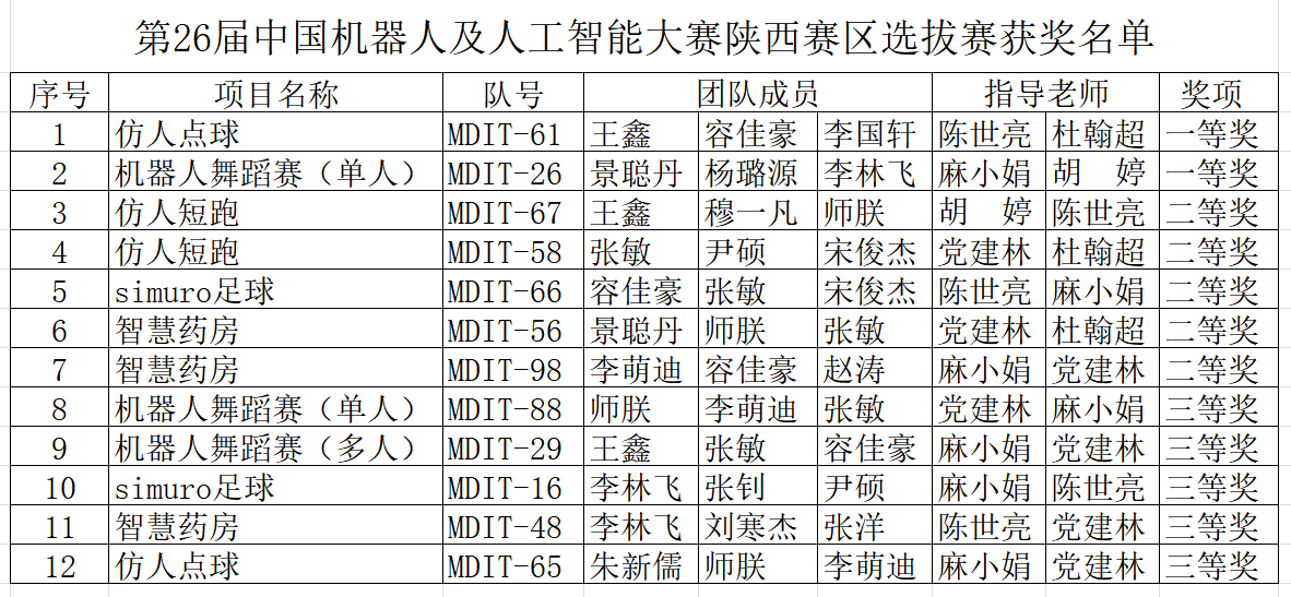 第26 届中国机器人及人工智能大赛陕西赛区选拔赛由西北工业大学承办,经过校赛选拔,共有来自省内31所高校的607支参赛队伍参加省级选拔赛。在比赛中雷竞技官网全体参赛队员同心协力、奋勇拼搏,不畏强手,取得了优异的成绩,其中一等奖和二等奖的项目将参加8月份进行的全国总决赛,陈世亮老师、胡婷老师和麻小娟老师荣获优秀指导教师奖。