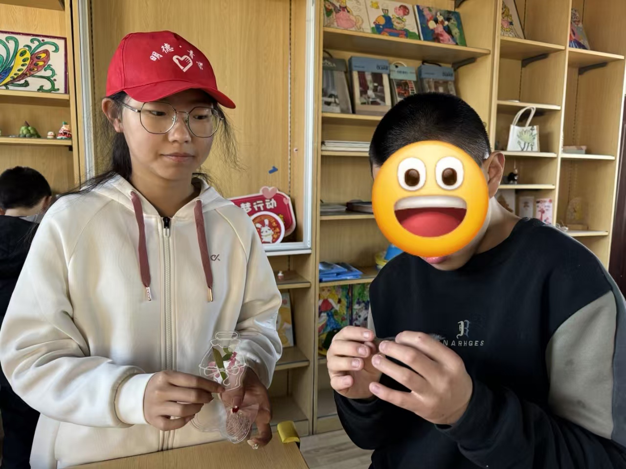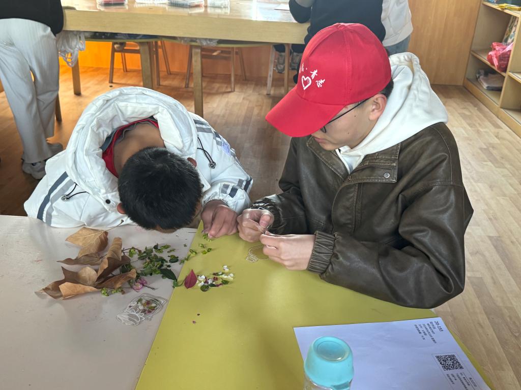 回到教室后,志愿者指导孩子们制作花草标本。从摆放植物到固定标本纸,孩子们认真跟随步骤,发挥想象力完成独特作品。举着自己制作的标本,孩子们露出自豪的笑容。