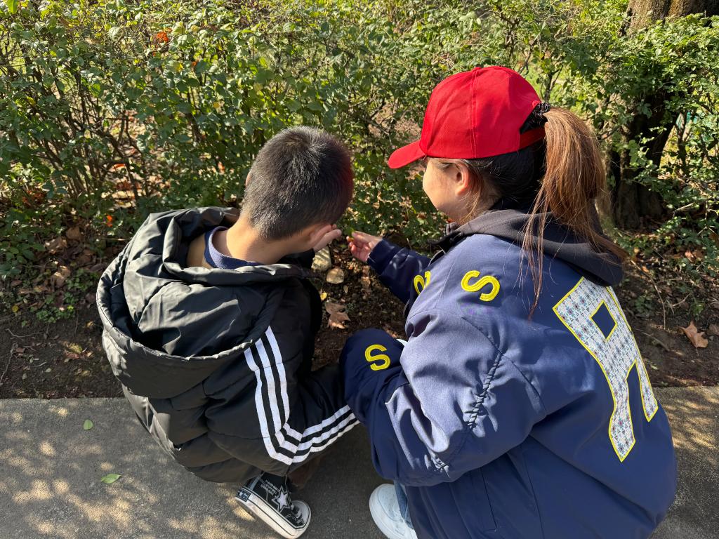 沐浴着春日暖阳,志愿者引导孩子们到户外观察花草。孩子们好奇地触摸叶片、轻嗅花朵,志愿者耐心讲解植物知识。孩子们小心翼翼采摘花草,眼中闪烁着探索自然的光芒。