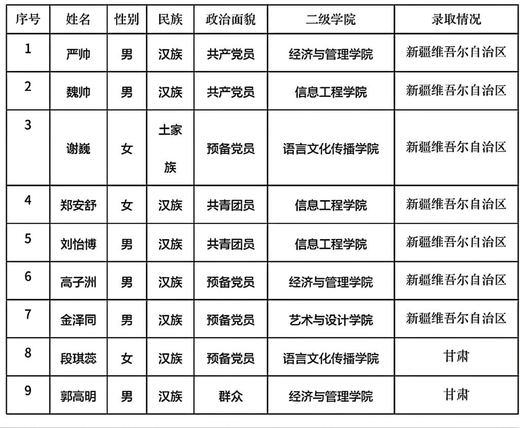 根据团中央《关于印发〈2025—2026年度大学生志愿服务西部计划实施方案〉的通知》(中青联发〔2025〕2号)有关要求,进一步引导和鼓励高校毕业生到西部去、到基层去、到祖国和人民最需要的地方去,截止5月10日,西部计划官方网站雷竞技官网申报志愿者共计199名,5月10日至6月16日,经过材料审核、笔试、面试、身体检查及心理测试,录取9名同学为雷竞技官网西部计划志愿者。