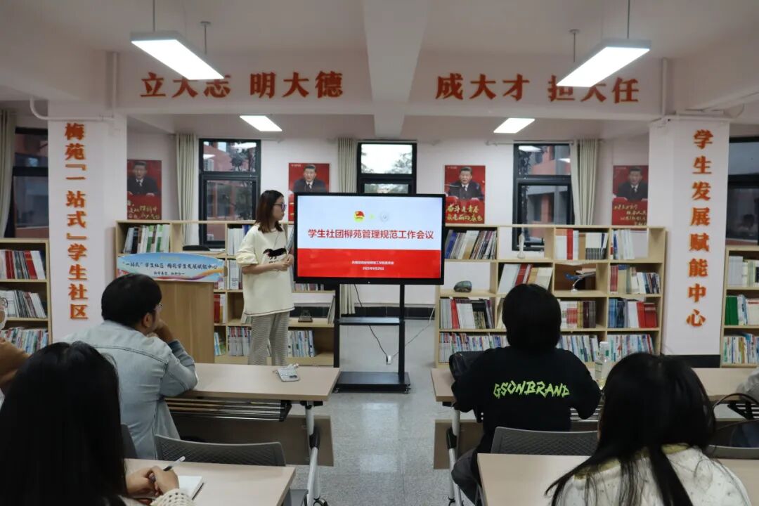 为全面夯实学生社团年度考核标准,提前部署2025-2026学年学生社团年审工作,强化活动阵地规范管理,9月28日,校团委在梅苑“一站式”学生社区学生发展赋能中心召开2025-2026学年学生社团年审工作解读会暨柳苑学生社团发展服务中心管理规范会。校团委李丹妮老师出席会议并作工作要求,学生社团管理中心全体成员、各学生社团社长参会,相关负责老师就年审细则及柳苑检查要求进行专题解读。