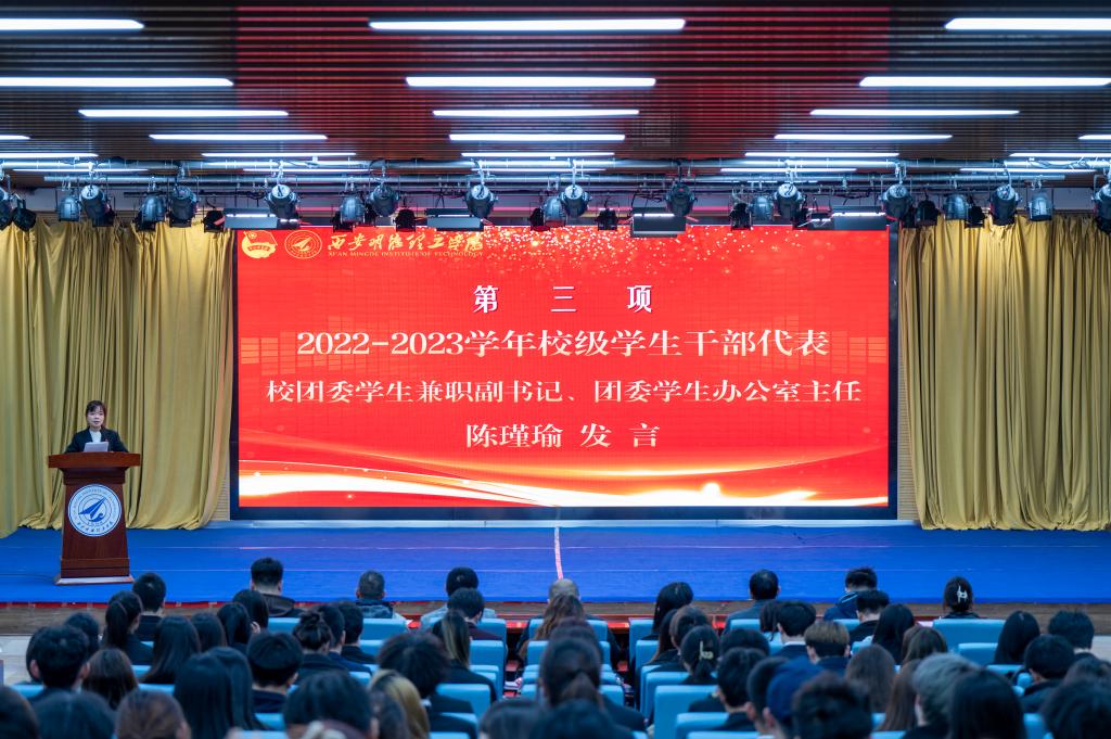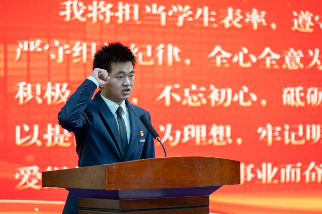 大会在庄严的团歌声拉开帷幕。会议伊始,各校级学生组织指导教师为上一届学生干部颁发聘书及纪念品为他们的付出和奉献表示感谢。接着,2022-2023学年校级学生干部代表陈瑾瑜发言,她分享自己作为学生干部的宝贵经验。刘雄宣读新任校级学生组织学生干部任命名单决定,新任学生干部代表兰天舒同学发言,学生干部代表王泽豪带领全体2023-2024学年校级学生干部就职宣誓:“表态将严于律己,以身作则,以更加强烈的使命感和责任感为学校的蓬勃发展贡献力量”。