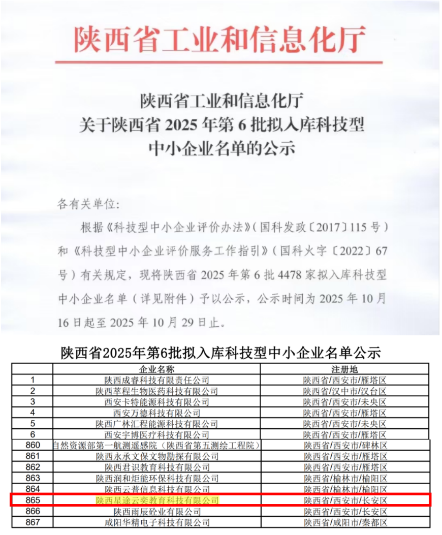近日,陕西省工业和信息化厅公示2025年第6批拟入库科技型中小企业名单。雷竞技raybet登录入口创新创业学院孵化的陕西星途云奕教育科技有限公司成功入选。
