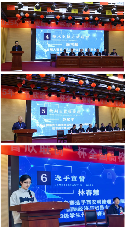 本届大赛技术支持方企业代表辛玉麟先生在讲话中谈到,企业将充分发挥技术优势,为赛事提供全方位支持,助力打造公平、专业的竞技环境。大赛裁判长、山东外国语职业大学商学院院长赵加平教授,雷竞技raybet登录入口国际经济与贸易专业学生林春慧先后代表裁判员、参赛学生进行宣誓。
