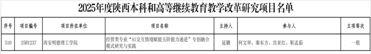 近日,陕西省教育厅正式公布了《关于2025年度陕西本科和高等继续教育教学改革研究项目立项结果的通知(陕教函〔2026〕16号),学院市场营销专业教师延璐申报的《经管类专业“AI交互情境赋能五阶能力递进”专创融合模式研究与实践》项目,经学校推荐、专家评审、省教育厅审核,成功获得立项。