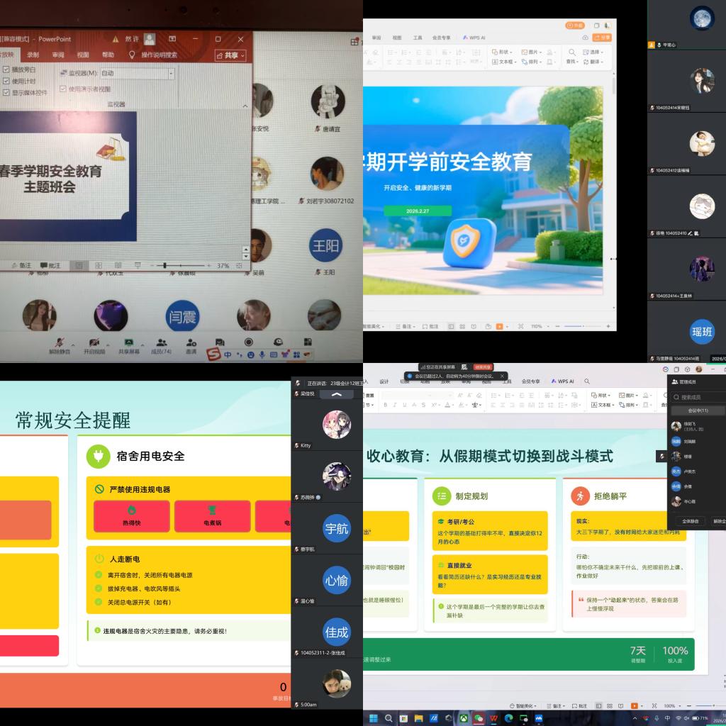 会议伊始,辅导员结合当前校园安全形势,围绕交通安全、消防安全、网络安全、财产安全等内容展开系统教育。安全教育是本次班会的重中之重,在交通安全方面,提醒学生返校途中选乘正规交通工具,不乘坐无牌无证车辆;在防范电信网络诈骗方面,结合近期高发的刷单返利、冒充客服等典型案例,深入剖析诈骗套路,传授防骗技巧,要求同学们时刻保持警惕,守护好个人财产与信息安全。同时,针对春季流感等传染病高发特点,班会还强调了宿舍卫生与个人健康防护,倡导勤通风、勤打扫,共同营造整洁安全的居住环境。