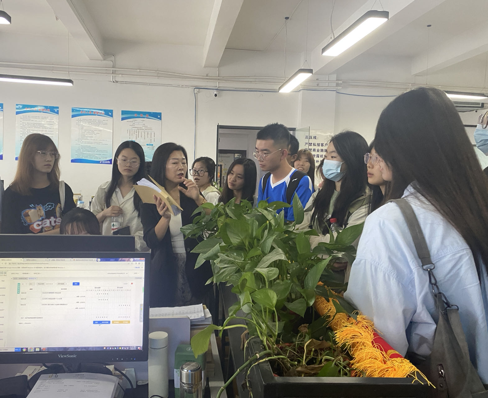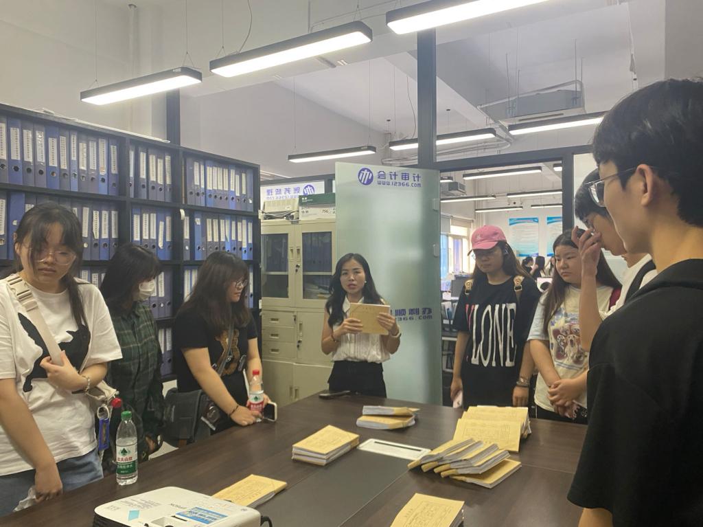在郝亚茹和万楠老师的带领下,学生们分成若干小组,参观了企业的各项日常业务活动,包括票据整理、税务筹划、财务管理、报表出具等业务。在观摩过程中,学生们在课堂上学习到的知识得以应用,对自己的专业发展方向有了更加明确的认知。