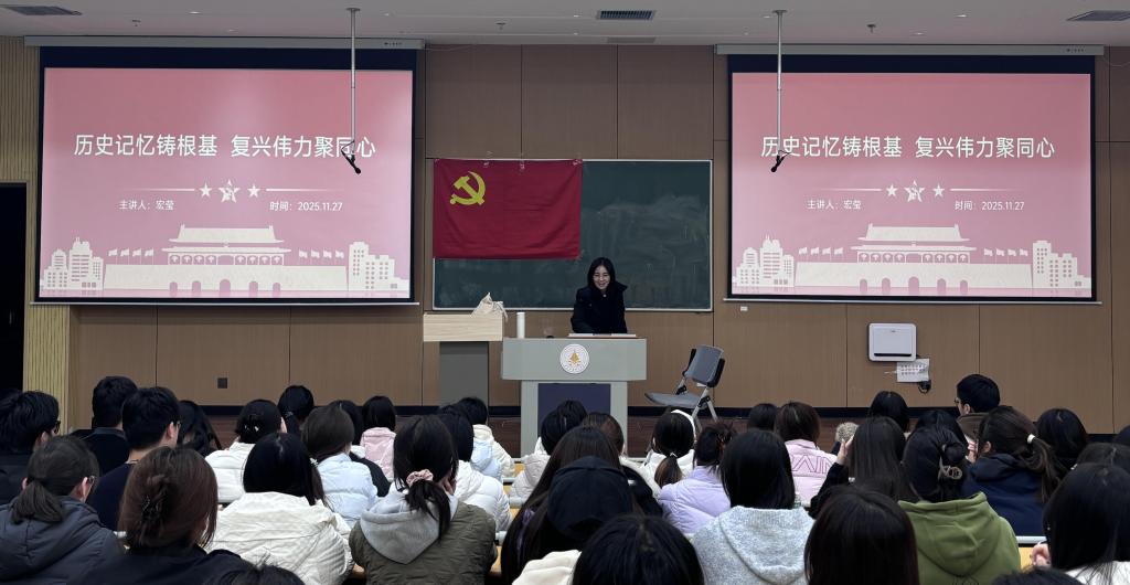 课上,宏莹老师以“历史记忆筑根基,复兴伟力聚同心”为题,围绕历史记忆中共同体锻造、复兴征程上的同心凝聚、从共识到行动的实践路线三个方面展开讲述。宏老师结合“八女投江”的悲壮案例、伟大抗战精神的内涵,深刻揭示了“历史记忆中共同体锻造”的实质,引导学生增强“以民族大义为念,以家国命运为怀”的崇高集体意识,勉励青年一代承先烈之志,以青春奋斗汇聚民族复兴的磅礴力量。交流互动环节,在场同学踊跃发言,积极提问,围绕历史启示与当代青年担当等话题与宏老师进行了深入探讨,现场学习氛围浓厚,反响热烈。