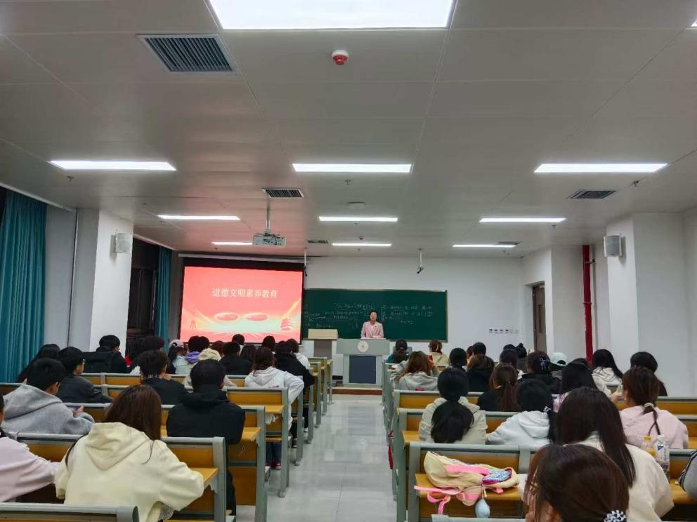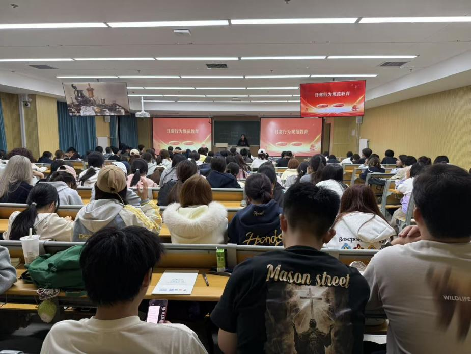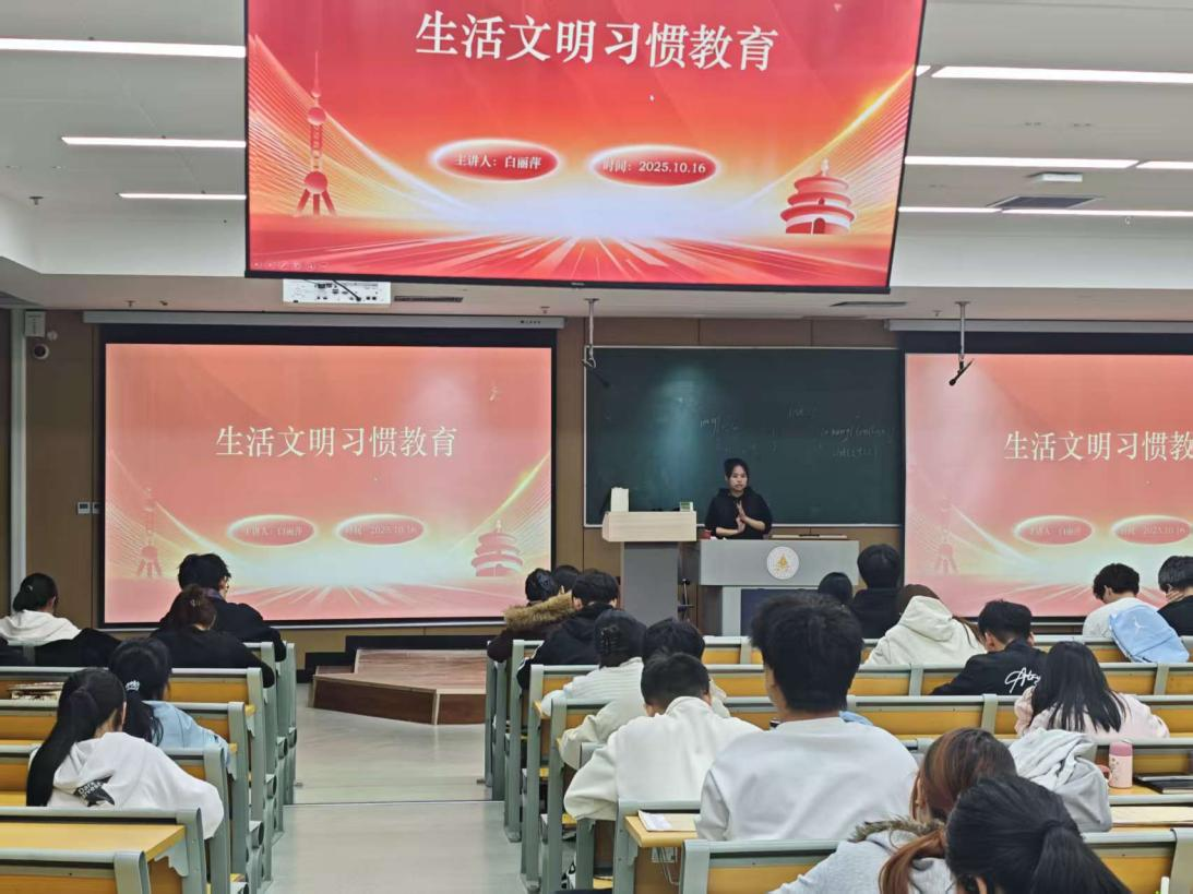 辅导员白丽萍结合学生手册围绕宿舍生活,强调宿舍卫生清洁、养成良好的作息规律、同学之间友好沟通协作、培养绿色低碳生活习惯等方面开展生活文明习惯教育。