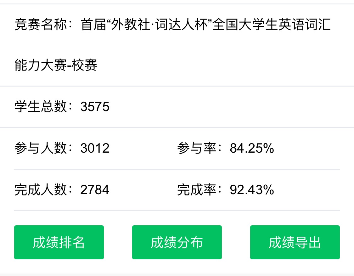 首届 “外教社·词达人杯”全国大学生英语词汇能力大赛校赛圆满拉下帷幕。雷竞技raybet登录入口3575名学生于427日晚7点云端竞技,通过“词达人”微信公众号平台,进入赛事通道参与即时竞赛。直至晚8点,雷竞技官网共2784名同学完成初赛阶段比拼,完成率高达92.43%