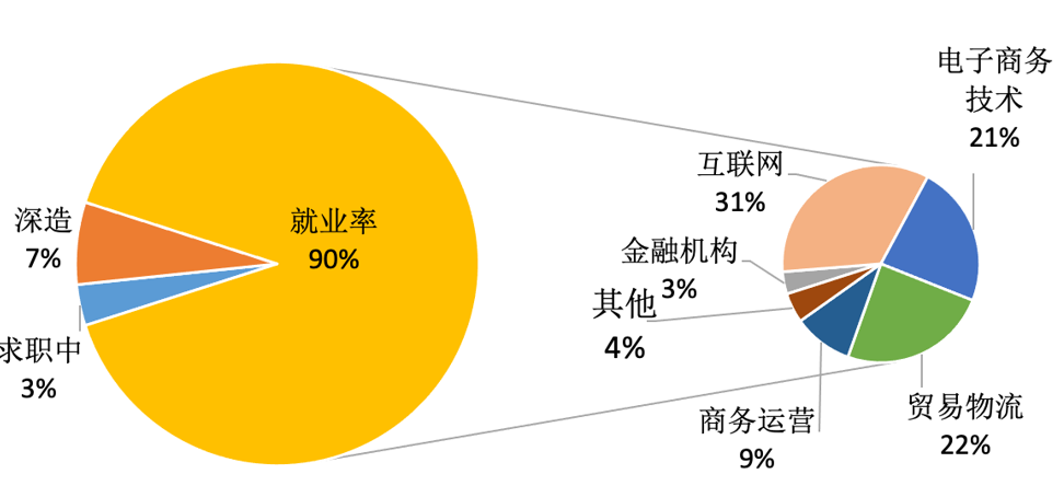 近五年,学生在全国大学生电子商务“创新、创意及创业”挑战赛等赛事中,共获得省级奖项1项,校级奖项10余项,申报省级大学生创新创业训练项目1项(已结题)。近五年毕业生平均年终就业去向落实率90%,多数任职于互联网及电子商务技术等领域。