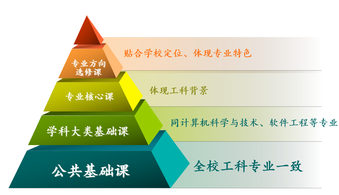 课程体系结构由公共基础课、学科大类基础课、专业核心课、专业方向选修课组成,其中公共基础课与全院其他工科专业一致,学科大类基础课同计算机科学与技术、软件工程等专业,专业核心课符合本专业培养目标和要求,体现工科背景,专业方向选修课贴合学校定位、体现专业特色。