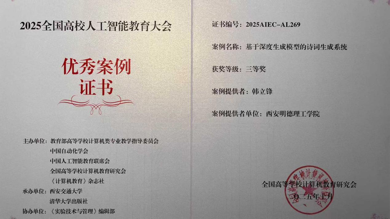 10月18日,2025全国高校人工智能教育大会在西安隆重举行。本次大会由教育部高等学校计算机类专业教学指导委员会、中国自动化学会、中国人工智能教育联席会、全国高等学校计算机教育研究会主办,西安交通大学、清华大学出版社承办,汇聚了来自全国各地的600余位专家学者。信息工程学院韩立锋老师应邀参会,荣获大会“优秀案例”三等奖和“优秀论文”一等奖。