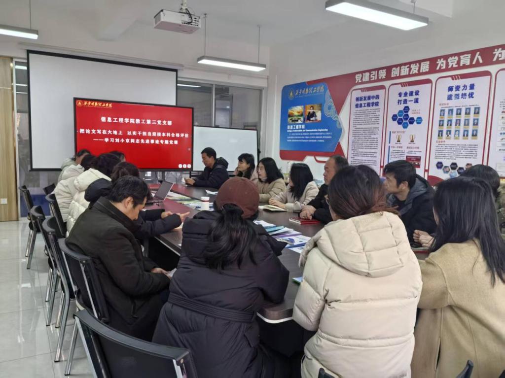 为深入学习贯彻习近平总书记关于教育的重要论述,切实将“把论文写在祖国大地上”的理念融入教育教学实践,凝聚全体党员迎评促建的思想共识与行动合力,1月7日上午,信息工程学院教工第三党支部在学院会议室开展“把论文写在大地上,以实干担当迎接本科合格评估”专题党课活动。支部全体党员参加此次学习,党支部书记李颖华同志主持党课并作专题讲解。