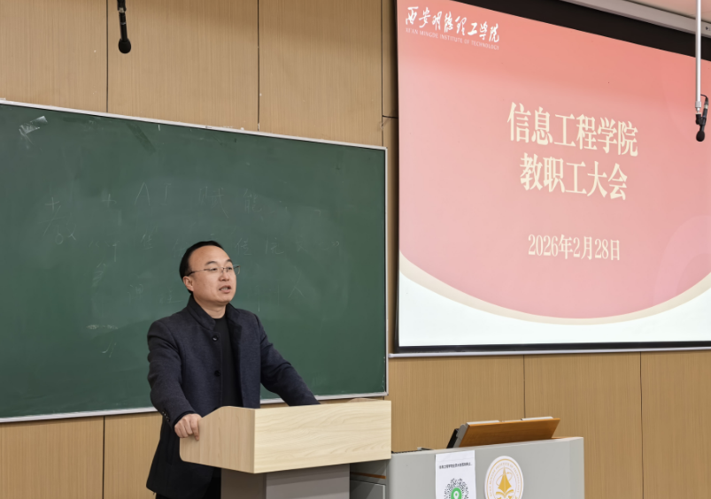 2月28日下午,信息工程学院召开2025-2026学年春季学期全院教职工大会。会议全面总结2025年度工作成效,部署新学期重点任务,统一思想、凝聚共识、鼓足干劲,为学院高质量发展与本科教学工作合格评估保驾护航。学院领导班子成员及全体教职工参会,会议由学院党委书记肖千春主持。
