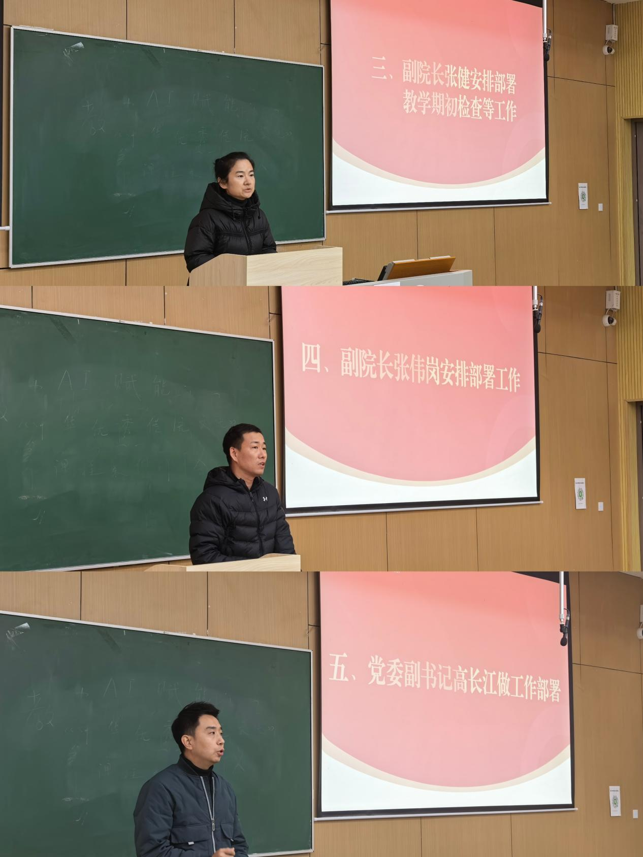 副院长张健、张伟岗,副书记高长江分别就分管工作进行具体安排。张健部署人才培养方案与课程大纲审核、教案提交、开学教学准备等工作,要求抓实教学设备检查、教学资料完备、思政案例融入等关键环节。张伟岗就实验室安全与开放管理提出要求,明确实验教师提前核验环境、规范填写日志。同时对新学期科研和学科竞赛等相关事项也做了部署安排。高长江重点部署2026届毕业生就业与考研复试工作。号召专业教师与辅导员协同发力、拓宽就业渠道、提升就业成效;专业负责人与任课教师当好学生考研导师,提升学院考研录取率。