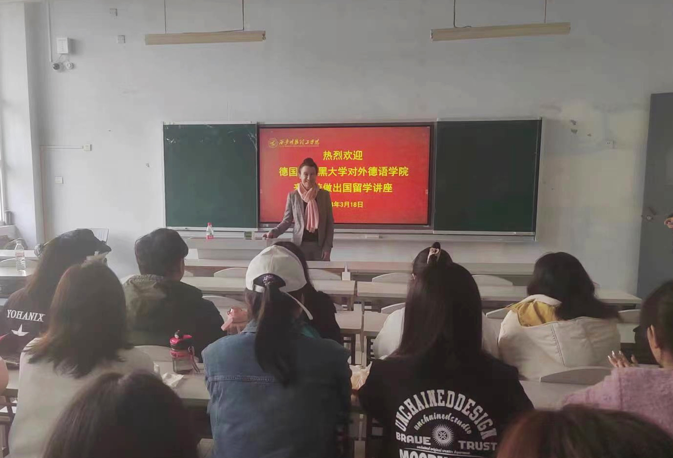 下午14:30在2号教学楼109教室Melanie Moll博士向我院德语专业学生介绍了慕大最新赴德交流项目:包括暑期研学项目、为期一月的带薪实习等。德语专业学生认真聆听,并在会场上积极询问相关事宜。