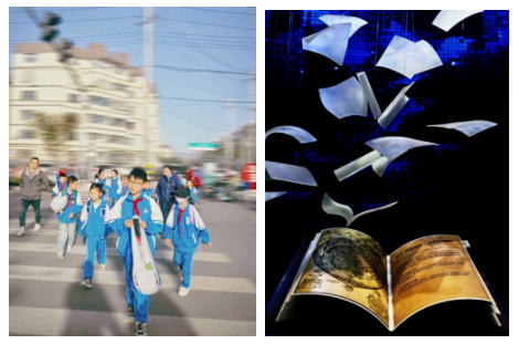 《上学路上》数字媒体艺术专业学生杨佳乐摄(左)《天书》数字媒体艺术专业学生张佳媛摄(左)