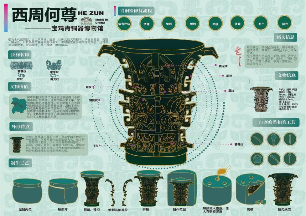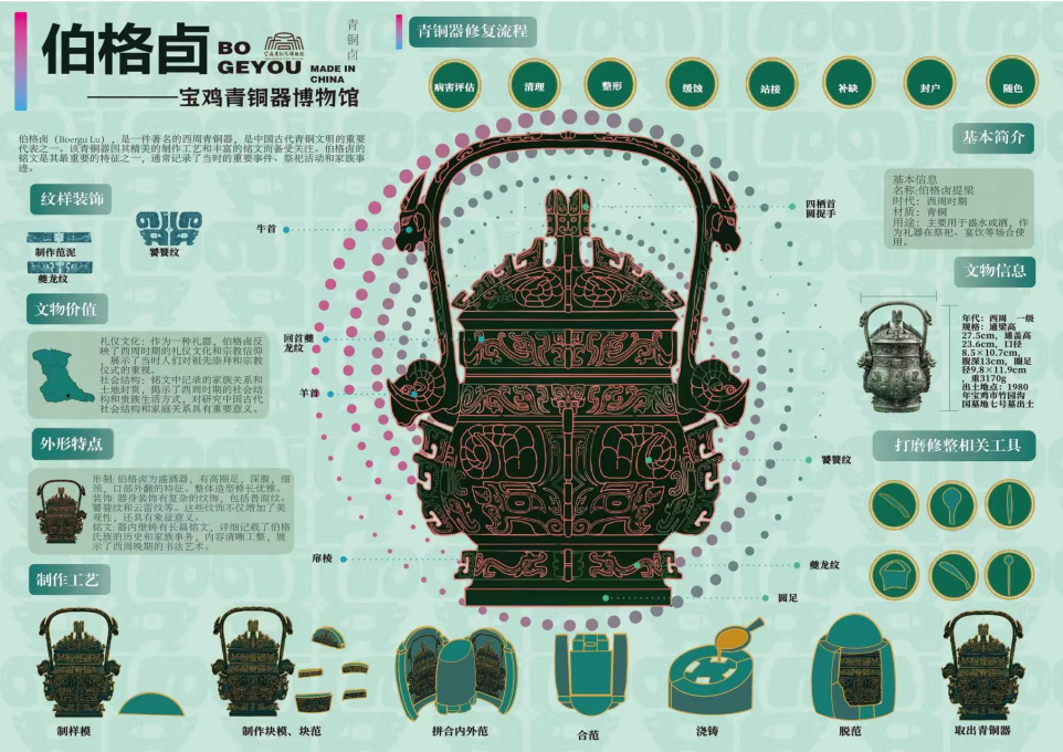 作品说明:本次设计聚焦于宝鸡青铜器博物馆的珍贵文物,我们以何尊、四十二年逨鼎、秦公镈、西周冬簋、单五父壶、伯格卣这六大瑰宝为蓝本来设计文物故事可视化设计。从青铜器博物馆文物故事可视化的角度出发,通过丰富的视觉表现形式和多元化的文化传播方式,希望能让宝鸡青铜器文化焕发出新的光彩,让更多人了解到宝鸡青铜器博物馆。期望能解决更多参观者因不懂文物而产生的困惑,感受到宝鸡青铜器文化的深厚底蕴和独特魅力。