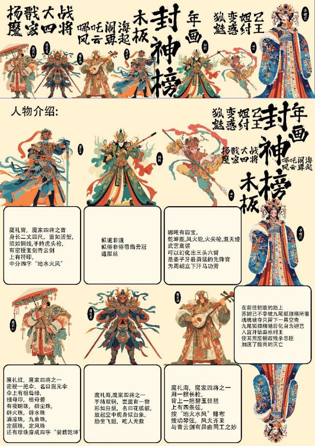 作品说明:本围绕着封神榜来设计创作的,主要涉及了三个故事,第一个是杨戬大战魔家四将;第二个是哪吒闹海,风云再起;第三个是狐变妲己,魅惑君王。设计了杨戬、魔家四将、妲己、哪吒几个人物的设计。每一张设计都以封神榜中描述的人物特点来设计的,比如:穿着、武器、动作,我们还将本次人物设计套样机制作了文创产品。