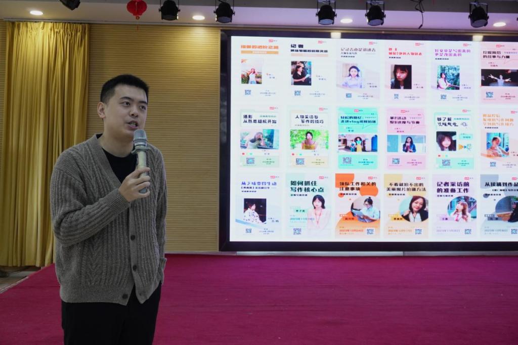 讲座伊始,祖雪蛟凭借自身在商业报道领域深耕多年的丰富阅历,结合商界集团大学生采编实践基地的建立、发展和内容产出情况,联袂高校共同培养适应新时代浪潮的新闻传播人才。他结合切身经验告诉同学们,要勇敢试错、大胆尝试,才能更好的积累经验,做到知行合一,将课堂所学真正用到工作与实践中。