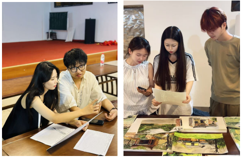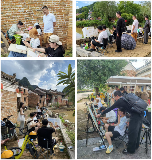 勾蓝瑶寨历史悠久,距今已有800 余年,拥有独特的瑶族建筑风格与淳朴的民俗风情。这里山水相依,青瓦石墙、木窗雕花的古建错落有致,充满了古朴的韵味,为艺术创作提供了丰富的素材与灵感源泉。抵达写生基地后,师生们迅速投入到紧张而充实的课程中。清晨,学生们迎着朝阳,分散在瑶寨的各个角落,支起画板,将眼前的美景用画笔描绘下来。无论是层叠的山峦、蜿蜒的水系,还是飞檐翘角的亭台楼阁、红砖青瓦的明清民居,都成为了他们画布上的主角。在绘画过程中,专业教师们穿梭于学生之间,耐心地进行指导,从构图、色彩搭配到笔触运用,为学生们答疑解惑,帮助他们更好地捕捉自然之美,提升绘画技巧。