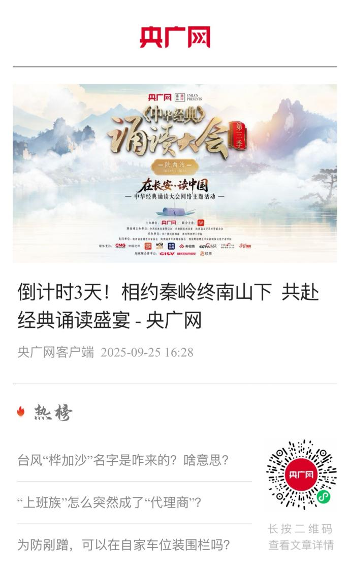 “在长安,读中国——中华经典诵读大会”作为央广网精心打造的文化品牌活动,已经成功举办两季,全国超30万人热情参与,全网触达量突破20亿人次,相关话题多次登上网络平台热搜,有效激发了全民的文化热情。一场浸润心灵、传承文脉的文化盛宴即将在雷竞技raybet登录入口拉开帷幕。诚邀广大诵读爱好者共同见证这一历史时刻,相约终南山下、共赴经典诵读,一同感受中华文化的独特魅力。