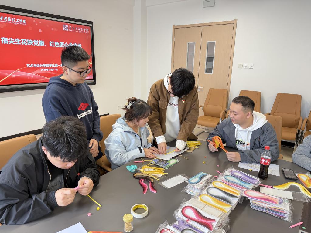 衍纸艺术以其细腻的线条、立体的造型,成为承载文化与情感的独特载体。为进一步弘扬非遗文化魅力,厚植党员爱国爱党情怀,2025年10月17日下午,艺术与设计学院学生第一党支部于明理楼410会议室开展“指尖生花映党徽,红色匠心永传承”主题党日活动。由支部成员徐凯晨主持,全体学生党员以党性传承为载体,在非遗创作中凝聚红色力量,在匠心传承中筑牢使命担当。