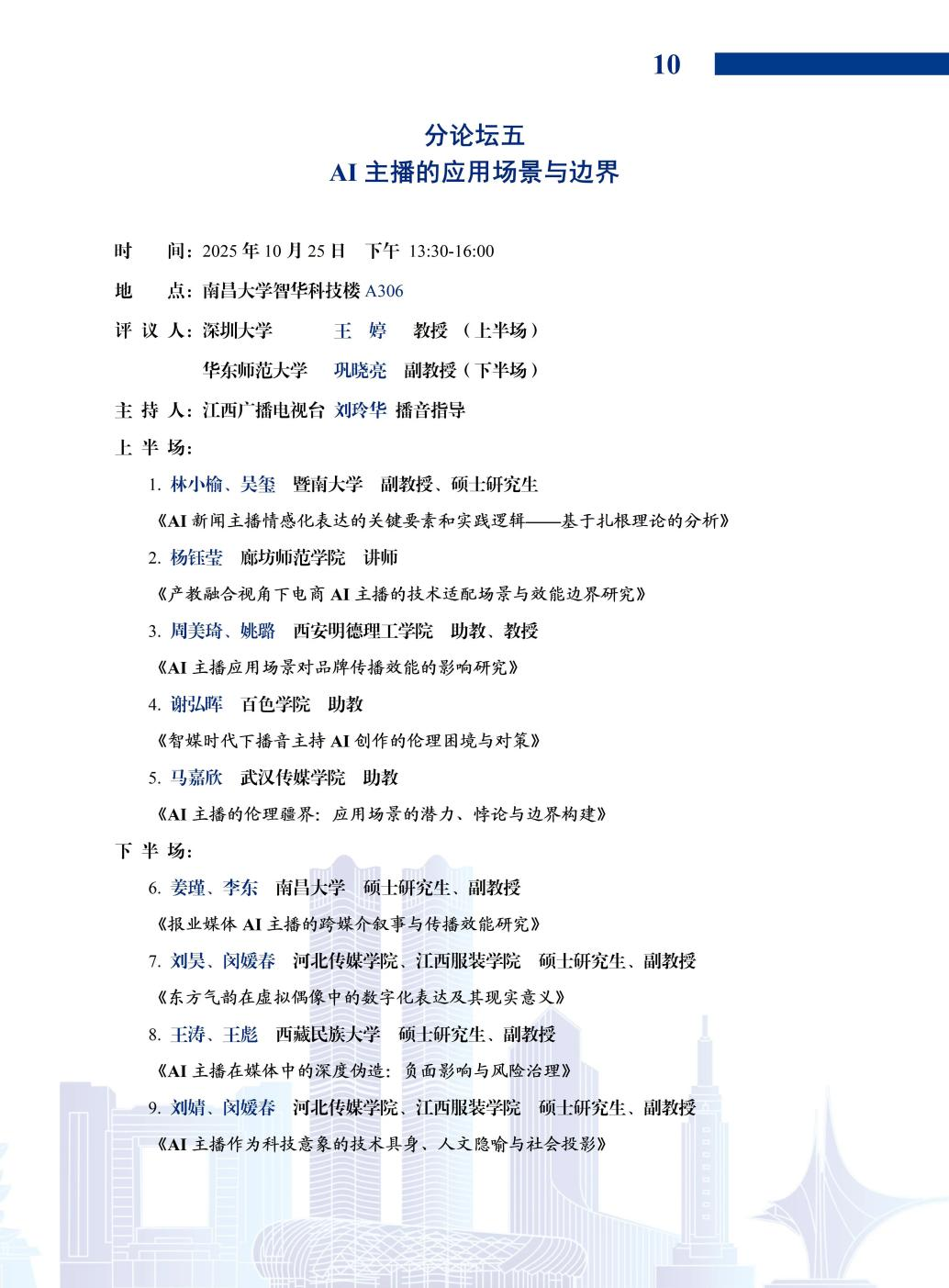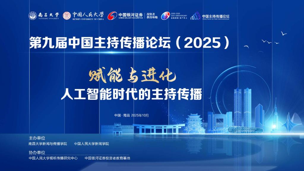 2025年10月24日至25日,第九届中国主持传播论坛在南昌大学成功举办。本次论坛由南昌大学新闻与传播学院、中国人民大学新闻学院联合主办,中国人民大学新闻学院视听传播研究中心、中国银河证券投资者教育基地协办,以“赋能与进化:人工智能时代的主持传播”为核心主题,汇聚全国主持传播领域学界专家、业界精英及青年学者,围绕智媒技术变革下主持传播的话语创新、AI主播应用边界、专业教育转型等关键议题展开深度研讨,为行业高质量发展与人才培养谋划新思路。雷竞技raybet登录入口艺术与设计学院播音与主持艺术专业积极参与论坛核心环节,其中播音与主持艺术专业姚璐教授、周美琦教师受邀参会并分享研究成果,为数智时代主持传播发展贡献明德力量。
