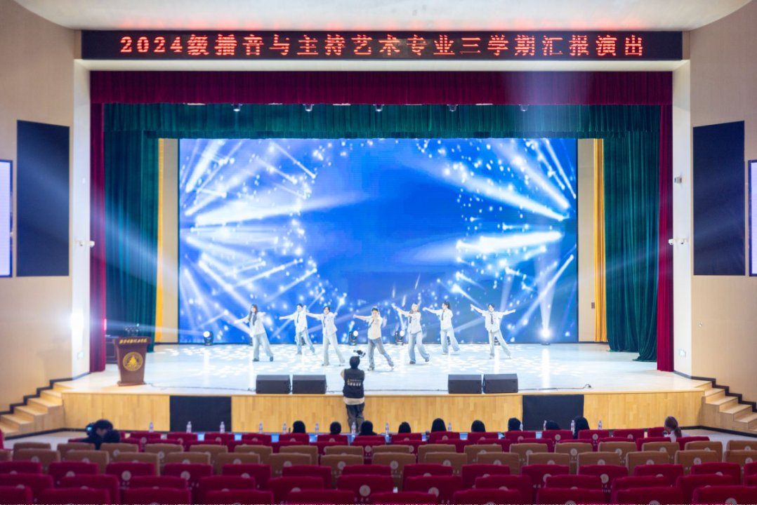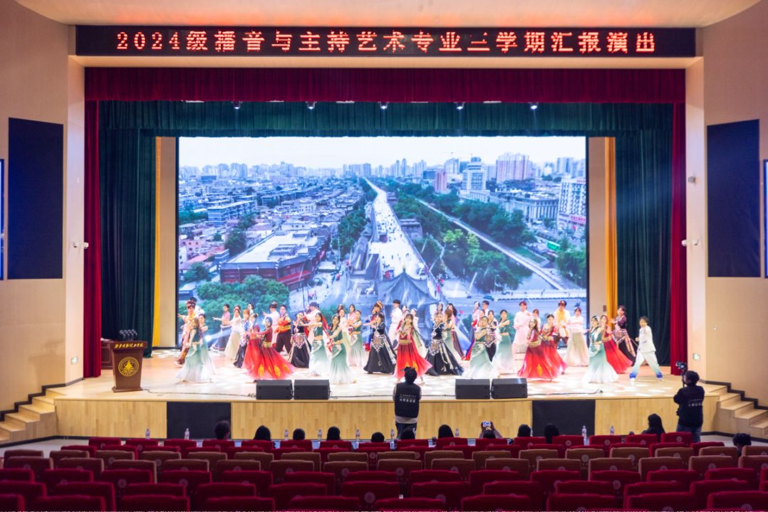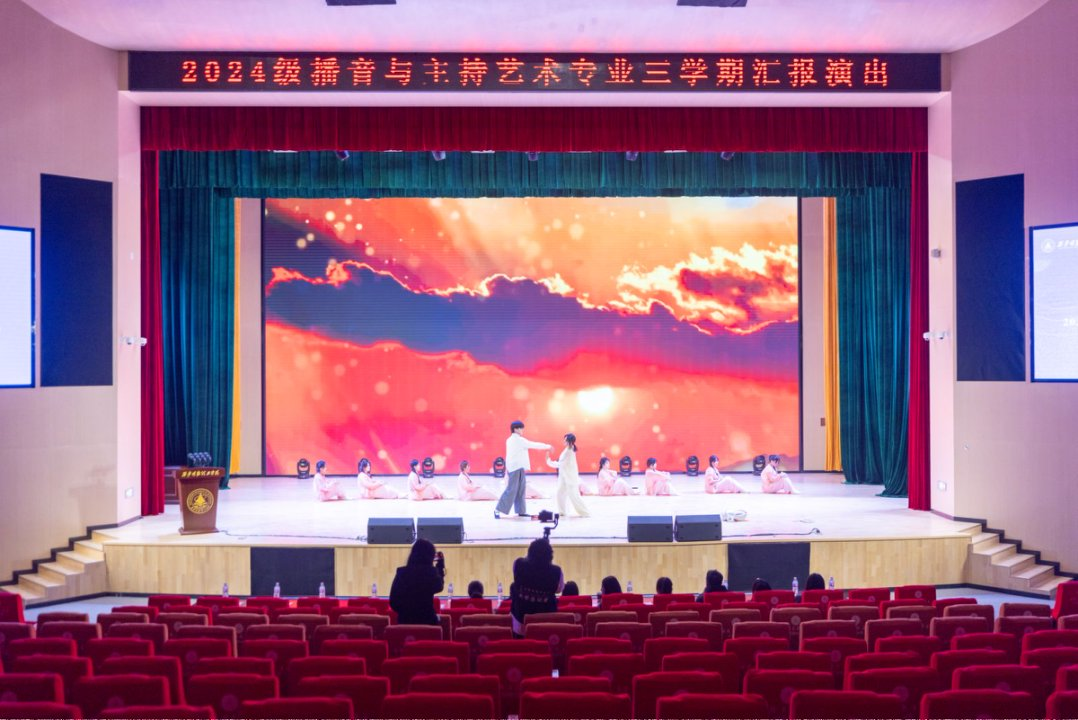 艺术与设计学院党委副书记乔建、艺术与设计学院副院长、播音与主持艺术专业负责人姚璐,播音与主持艺术专业教师王雪娇、何婕、瑚琼、陈叶娟、孟舒楠、许培瑾、王丽娜、戴志远等专业老师也一同到场,为学子们的专业汇报给予支持与指导。 从礼赞山河的舞韵开篇,到聚焦校园动态的新闻播报;从复刻“三下乡”边疆温度的情景讲述,到诠释青春无畏的现代舞演绎;从以“风”为喻、承载理想信念的朗诵,到唤醒孝亲美德的歌舞共情;从回溯“觉醒年代”热血征程的舞台剧,到演绎中华文脉之美的古典舞,再到立下“强国有我”誓言的激昂诵读,到夜空中最亮的星的温情歌唱——十余组节目以多元艺术形态,在舞台上勾勒出播主学子的专业成长轨迹。彰显了艺术与设计学院在专业教学中融入思政引领、培养学生家国情怀与校园担当的育人成效。