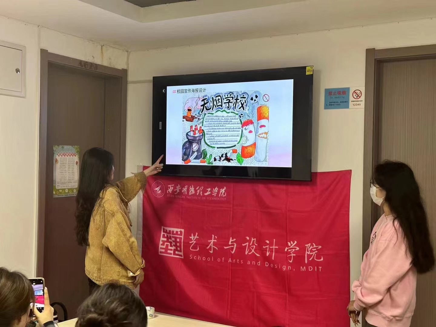 会上,组织大家观看了艺术与设计学院拍摄的相关禁烟活动的微电影宣传片和海报设计。