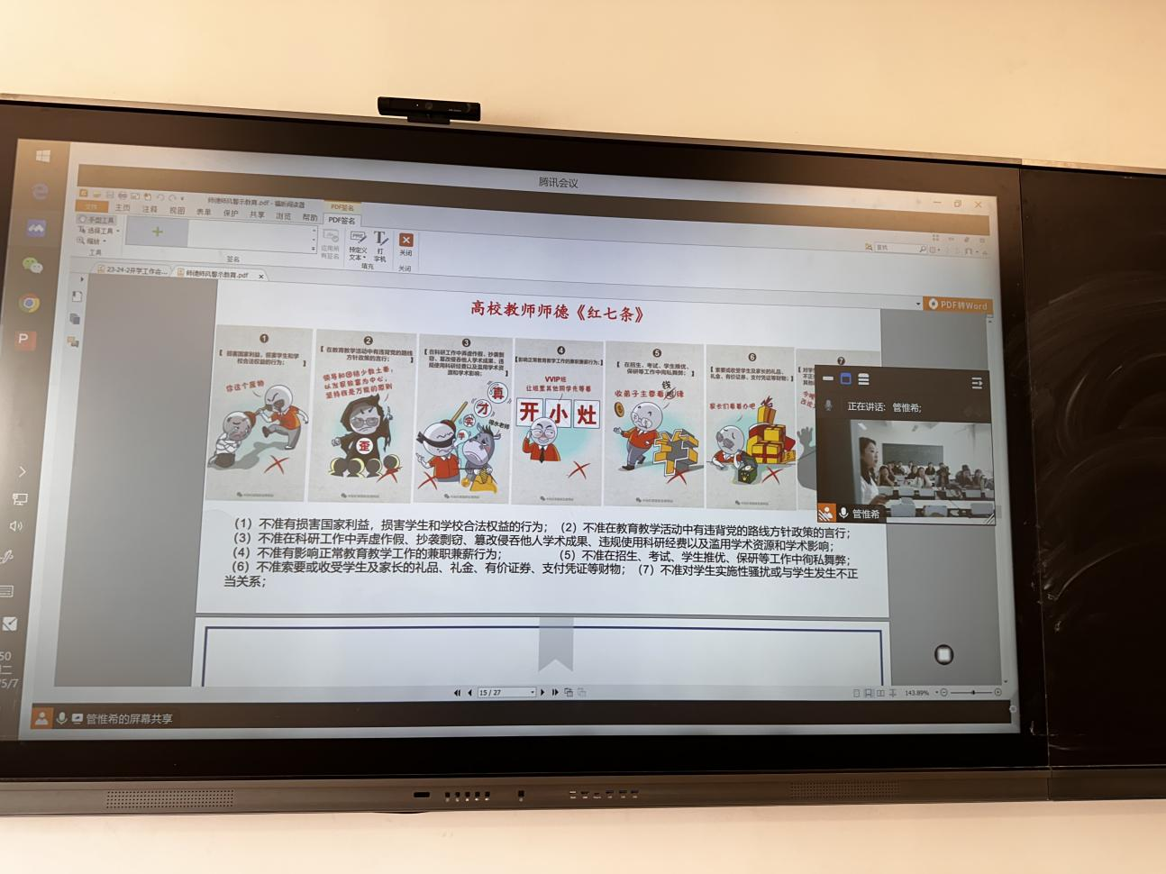一是深入解读《关于加强和改进新时代师德师风建设的意见》《中共中央、国务院关于全面深化新时代教师队伍建设改革的意见》《新时代高校教师职业行为十项准则》《关于高校教师师德失范行为处理的指导意见》等文件,要求所有教师自觉遵守职业道德,不断提升自身的教育教学水平,为学生树立良好的榜样。