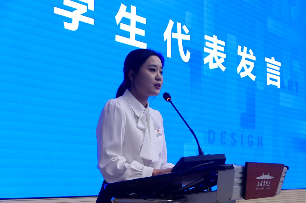 优秀校友代表、郭莘空间设计(西安)有限公司创始人郭莘发言。在明德这方土地上,学子们朝气蓬勃、迅速蜕变,老师们默默无闻、悉心指导,教学相长,学子与母校一同成长。2024届学弟学妹已如期完成学业,带着艺术的智慧、设计的理想,即将踏上新征程,开启人生新篇章。希望学弟学妹们在以后的工作道路上,牢记明德校训,怀揣赤诚之心,坚持艺术创作,以优异成绩和实际行动为母校的发展贡献力量!