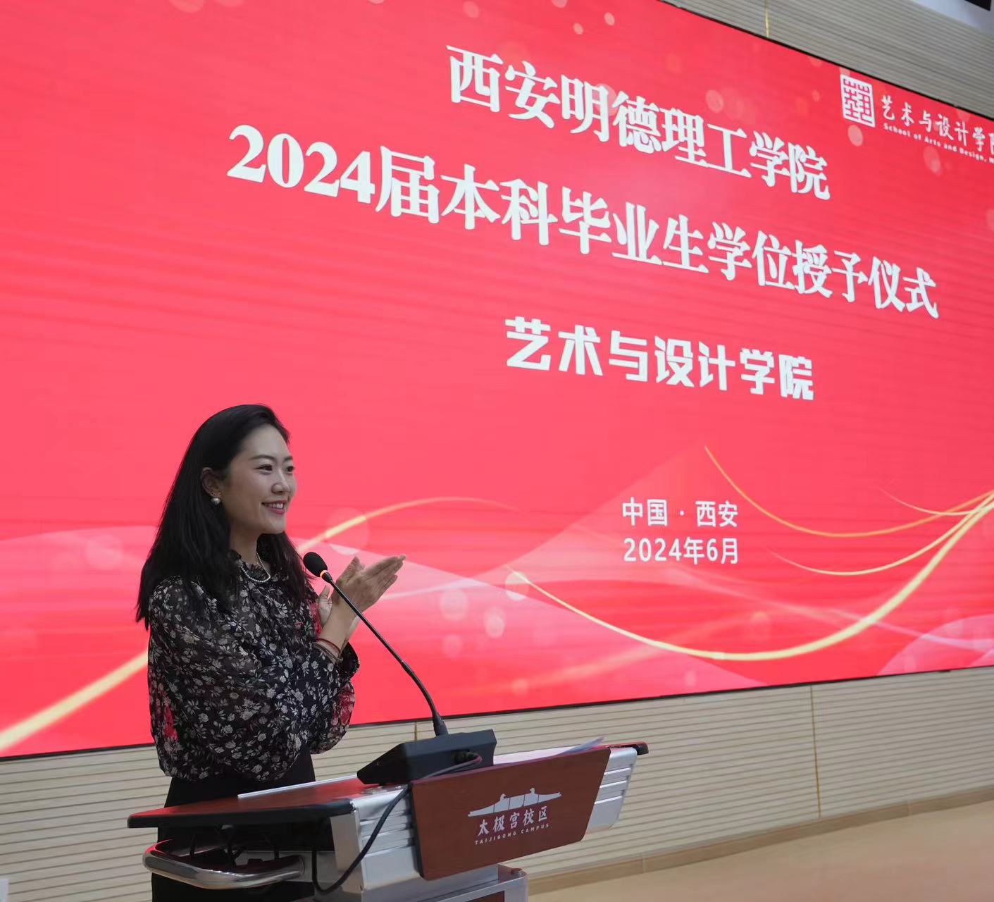 毕业生代表南露同学发言,她回顾四年校园时光,深情告白母校、学院与老师。她讲到母校如同母亲一般,给予了明德每位学子无私的爱与奉献,感谢大学四年学校的培养,学院的帮助,老师的教诲与鼓励,同时感谢大学四年同学的陪伴。她表示将带着所学所思所想,走向更⼴阔的天地,去追寻自己的梦想,无论未来面临怎样的挑战,都会保持对艺术的热爱和追求,并相信自己⼀定能够创造出属于自己的人生精彩。