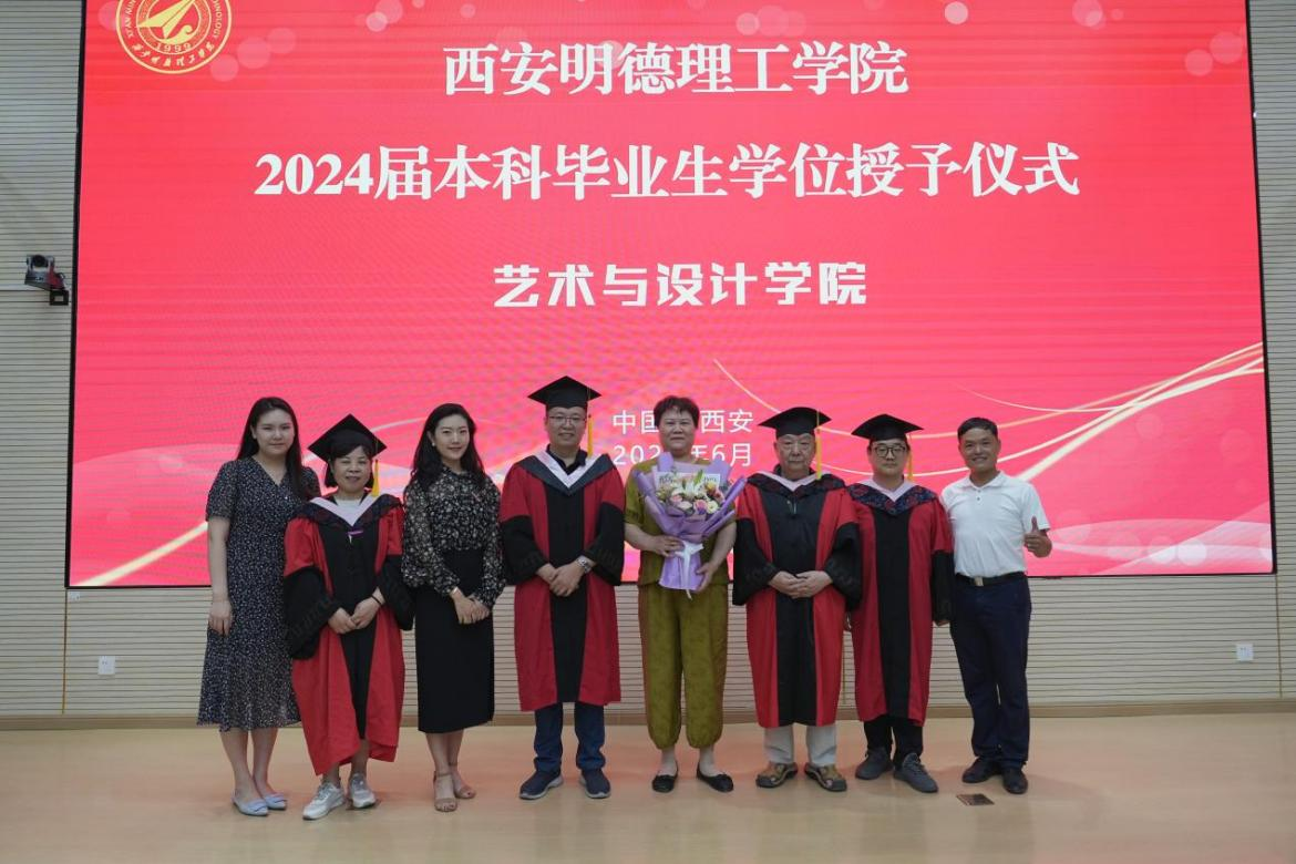 学位授予仪式开始。学院院长苟秉宸教授,副院长冯强老师,学院特聘教师、大师工作室柏雨果教授,学校学位评定委员会委员舒粉利老师为毕业生拨穗正冠并颁发学位证书。同学们依次上台并合影留念。