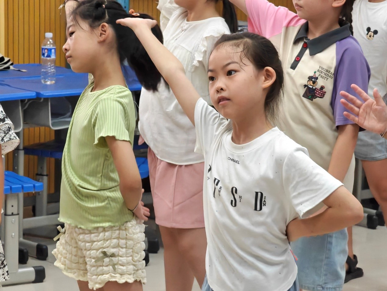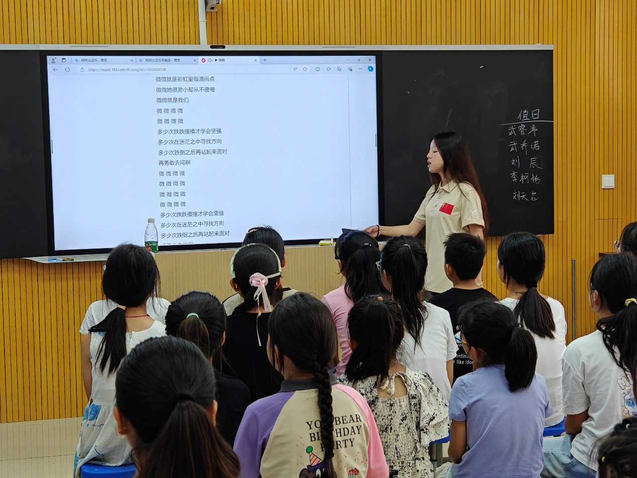 在授课的过程中,“小”老师们不断调整教授的方法及进度,确保不同年龄段的孩子们都能吸收接纳这些新的知识技能。孩子们对于悦耳动听的音乐和新颖动感的舞蹈显得格外地有兴趣,在学习的过程中也十分地认真,台上老师的每一个动作他们都在仔细地学习、模仿,所教授的每一句歌词都在努力记忆、歌唱。