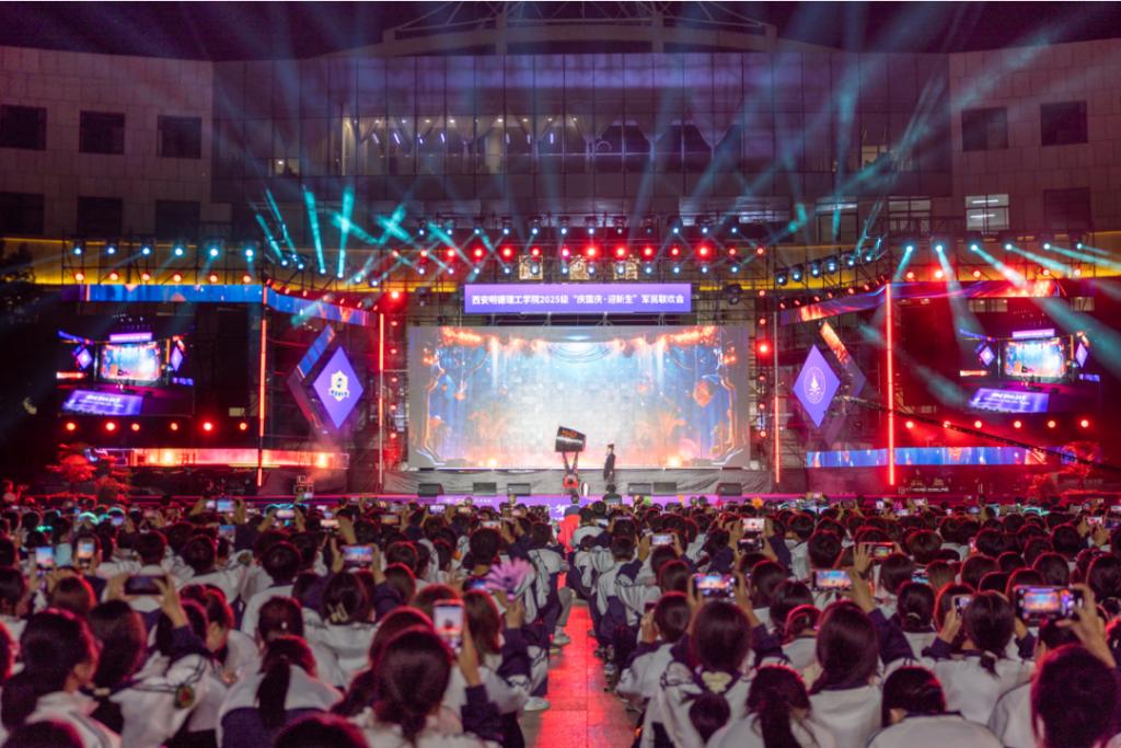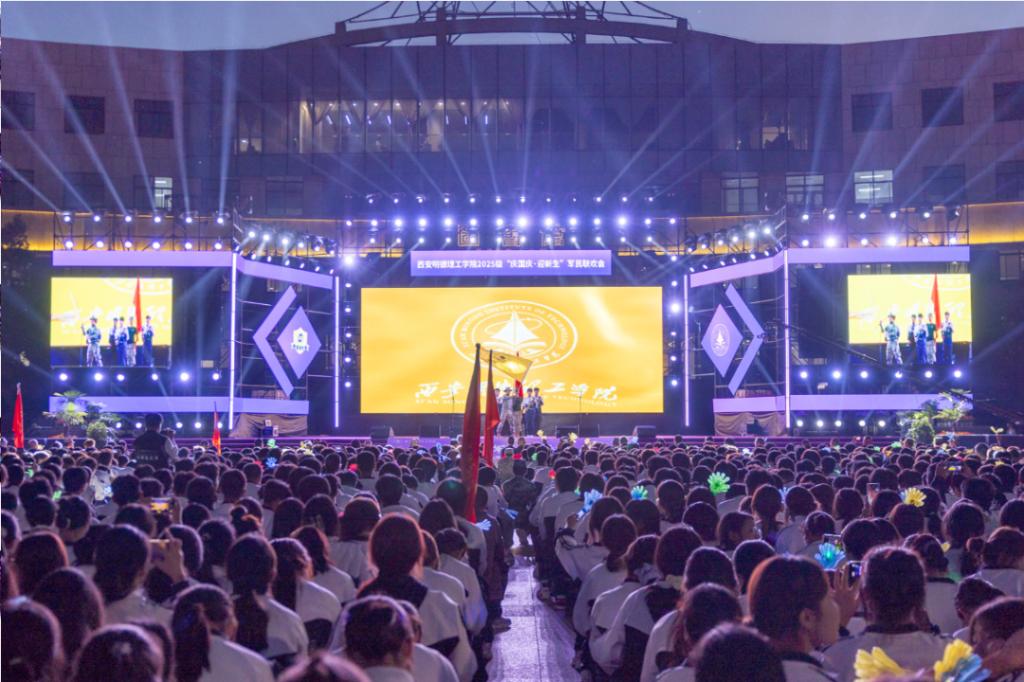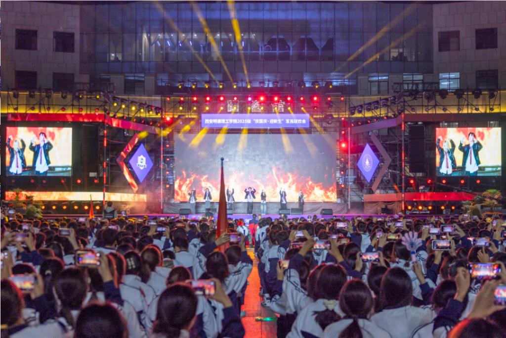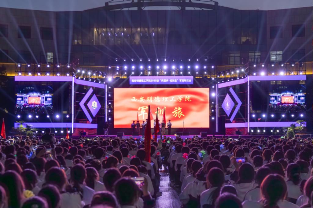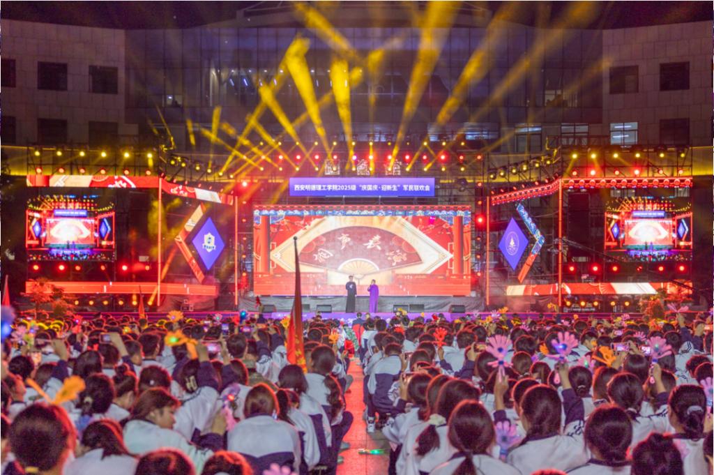 9月19日晚,“明德情·军旅魂·青春梦”2025级“庆国庆·迎新生”军民联欢会在学校中心广场盛大举行。陕西金叶科教集团董事局主席、总裁,明德源教育集团董事长、总裁,学校董事长、执行校长袁汉源,陕西金叶科教集团监事会主席冯卫平,陕西金叶科教集团董事王毓亮,陕西金叶科教集团副总裁秦忠,陕西金叶科教集团副总裁陈宏团,陕西金叶科教集团财务总监熊汉城,明德源教育集团常务副总裁、学校副董事长、执行董事张琳,学校校长王志刚,学校党委书记马川鑫,以及明德源教育集团领导、全体校领导,学校各职能部门、教辅单位、二级学院领导,全体军政干部、2025级全体学生、家长代表参加此次晚会。